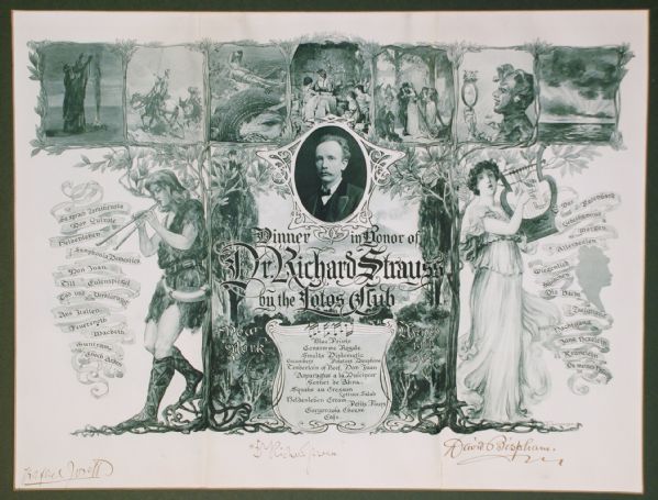 DINNER IN HONOR OF Dr. RICHARD. STRAUSS by THE LOTOS CLUB New York MARCH 19,1904. Lovely vignettes representing the tone poems and songs which are listed right and left with the menu at the lower center below a picture of STRAUSS. STRAUSS at the bottom center, Rafael Joseffy at the left and David Bispham at the right. Mostly in shades of blue and grey 15" x 20".