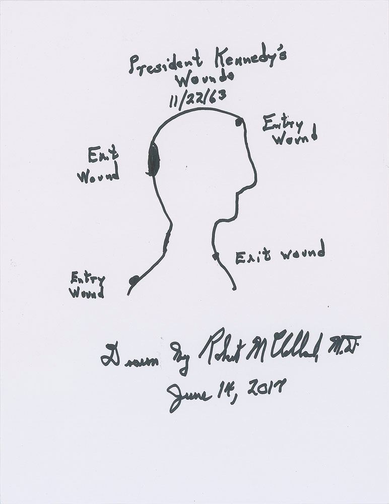 Surgeon at Parkland Hospital who attended to President Kennedy after he was shot on November 22, 1963. Original signed felt tip sketch of "President Kennedy's Wounds, 11/22/63" on a white 8.5 x 11 cardstock sheet, signed "Drawn by Robert McClelland, M.D., June 14, 2017." The sketch shows President Kennedy's head in profile, with the entry and exit wounds labeled on the head and neck. In very fine condition. This version of McClelland's sketch has the wounds coming from different directions, which was the subject of some discrepancy in his testimony before the Warren Commission; he initially characterized the wound at the front of the neck as an entrance wound, but backtracked on his ability to identify with certainty the exit and entrance wounds. However, he has always maintained that the mortal wound—the head wound—came from the front, likely fired from the 'Grassy Knoll' ahead of Kennedy's motorcade. McClelland maintains that there were at least two shooters and that the assassination was likely a conspiracy involving government elements.