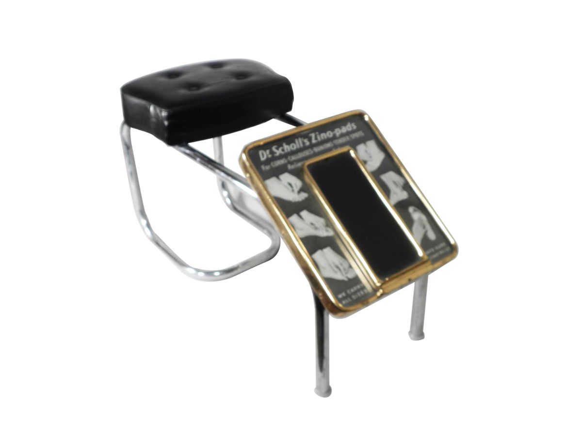 Dr. Scholl's Zino-pads Advertising Shoe Stool. Chrome frame, leather seat and copper framed advertisement. Excellent original condition. 10 X 29 X 16 inches.