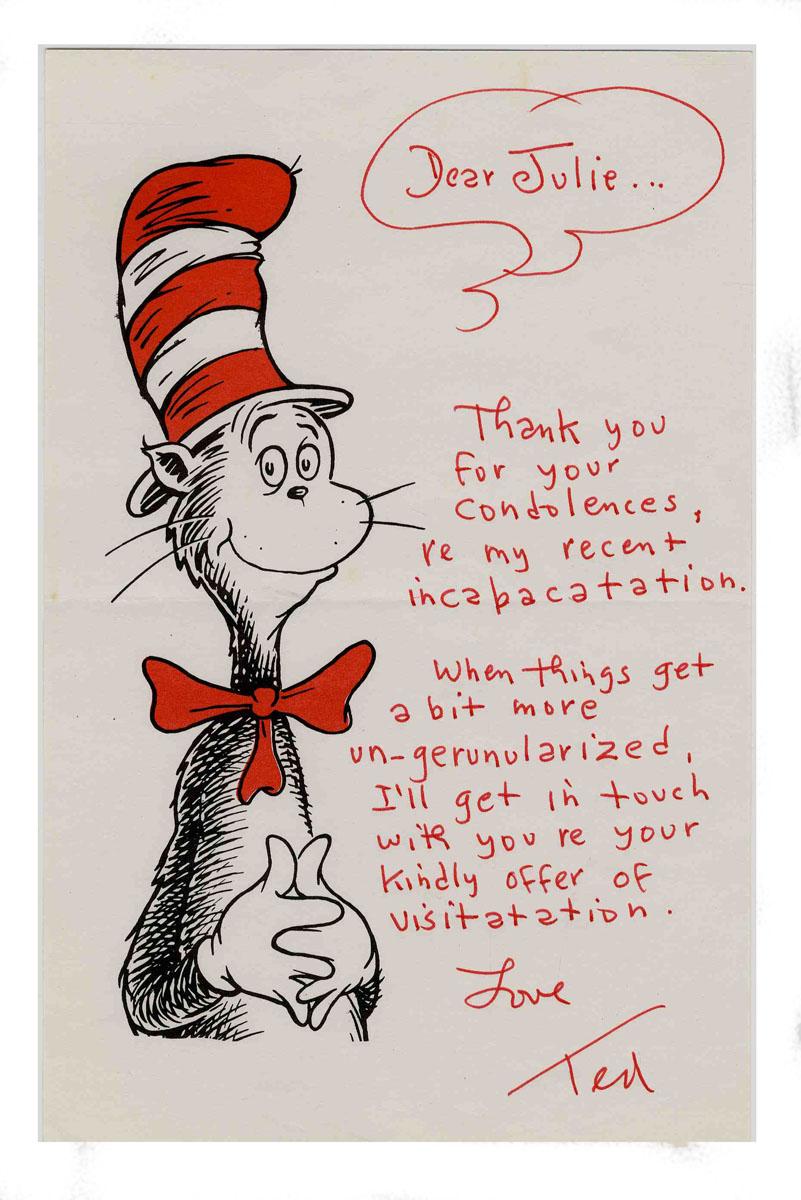 Delightful Dr. Seuss autograph letter signed, written upon his personal ''Cat in the Hat'' stationery. Undated letter written in red ink reads in full, ''Dear Julie…Thank you for your condolences, re my recent incapacatation [sic]. When things get a bit more un-gerunularized, I'll get in touch with you re your kindly offer of visitation. Love Ted''. Single page letter measures 5.5'' x 8.5''. Single fold, else fine, ideal for display.