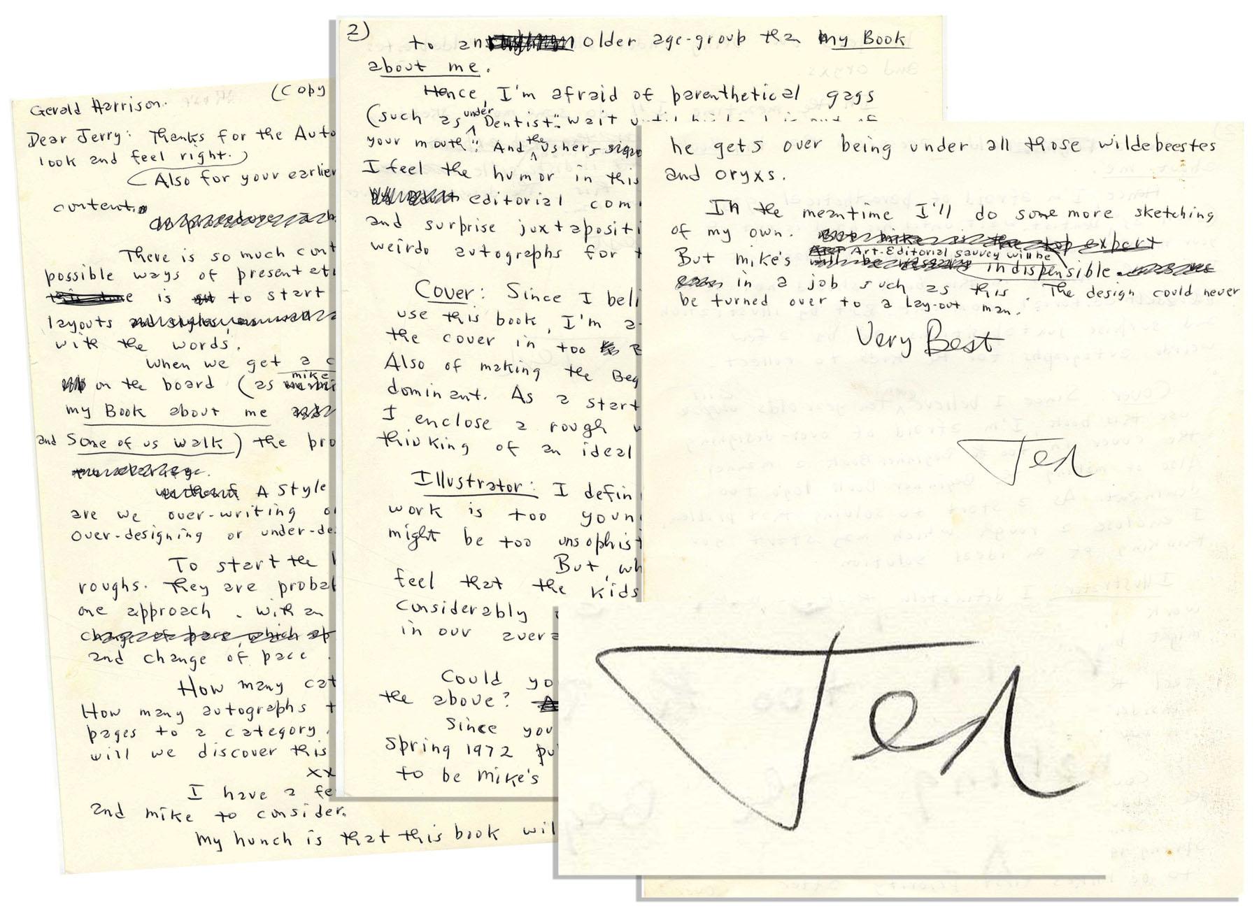 Dr. Seuss autograph letter signed ''Ted'', written to Gerald Harrison, president of the children's literature department at Random House. Undated letter reads in part: ''Dear Jerry:…My hunch is that this book will sell to an older age-group than My Book About Me…I feel the humor in this book should not be in editorial comment. But by illustration and surprise juxtapositions and by a few weirdo autographs for the kids to collect…'' Three page letter, on two sheets, measures 8.5'' x 11''. Near fine.