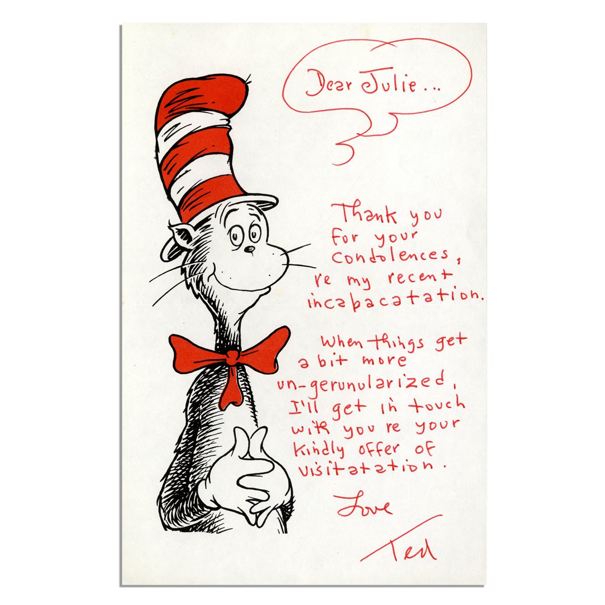 Delightful Dr. Seuss autograph letter signed, written upon his personal ''Cat in the Hat'' stationery. Undated letter written in red ink reads in full, ''Dear Julie...Thank you for your condolences, re my recent incapacatation [sic]. When things get a bit more un-gerunularized, I'll get in touch with you re your kindly offer of visitation. Love Ted''. Single page letter measures 5.5'' x 8.5''. Single fold, else fine, ideal for display.