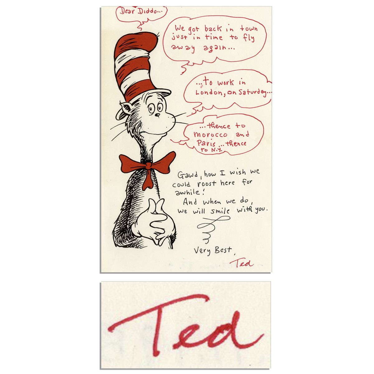 Dr. Seuss autograph letter signed on stationery with his world-famous ''Cat in the Hat''. He writes in red ink: ''Dear Diddo...We got back in town just in time to fly away again...to work in London, on Saturday...thence to Morocco and Paris... thence to N.Y. Gawd, how I wish we could roost here for awhile! And when we do, we will smile with you. Very best, Ted''. Letter is undated, but lot includes original envelope which is postmarked 11 July 1983 from Washington, D.C. Measures 5.5'' x 8.5''. Crease at center, mild toning, and ink notations to verso, else near fine.