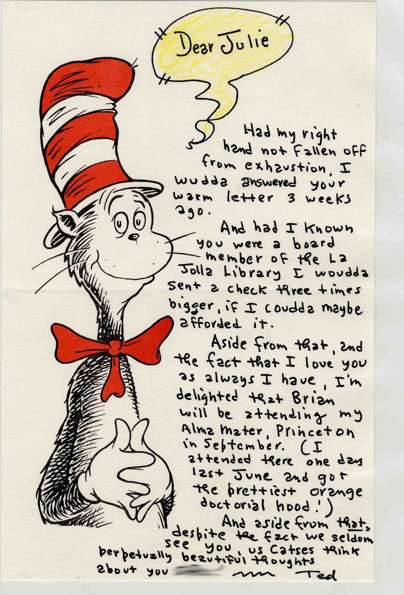 Dr. Seuss autograph letter signed upon his personal ''Cat in the Hat'' stationery. Undated letter addressed to a Julie reads in part, ''Had my right hand not fallen off from exhaustion, I wudda answered your warm letter 3 weeks ago. And had I known you were a board member of the La Jolla Library I woudda sent a check three times bigger, if I coudda maybe afforded it. Aside from that, and the fact that I love you as always I have, I'm delighted that Brian will be attending my alma mater, Princeton in September. (I attended there one day last June and got the prettiest orange doctorial hood!) And aside from that, despite the fact we seldom see you, us Catses think perpetually beautiful thoughts about you...Ted''. Letter, measuring 5.5'' x 8.5'' is in near fine condition.