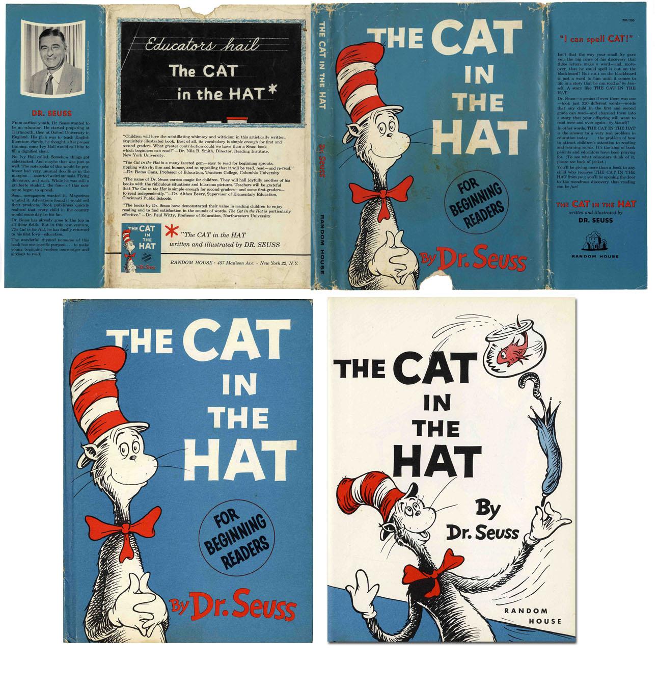 First printing copy of Dr. Seuss' ''The Cat in the Hat'' with first printing dustjacket. Random House: 1957. Book and dustjacket meet all first printing requirements: jacket shows 200/200 price to inside flap, educator reviews on verso and no mention of the Beginner Books series, book has matte boards and pages are cream colored. Dustjacket contains chipping to top and bottom edges, and is missing a small portion of the lower front. Dustjacket also shows scattered soiling, creasing and wear. Edges of book slightly bumped, previous owner's gift inscription to interior page and small bookstore bookplate to lower right corner of front free endpaper. Overall good condition.