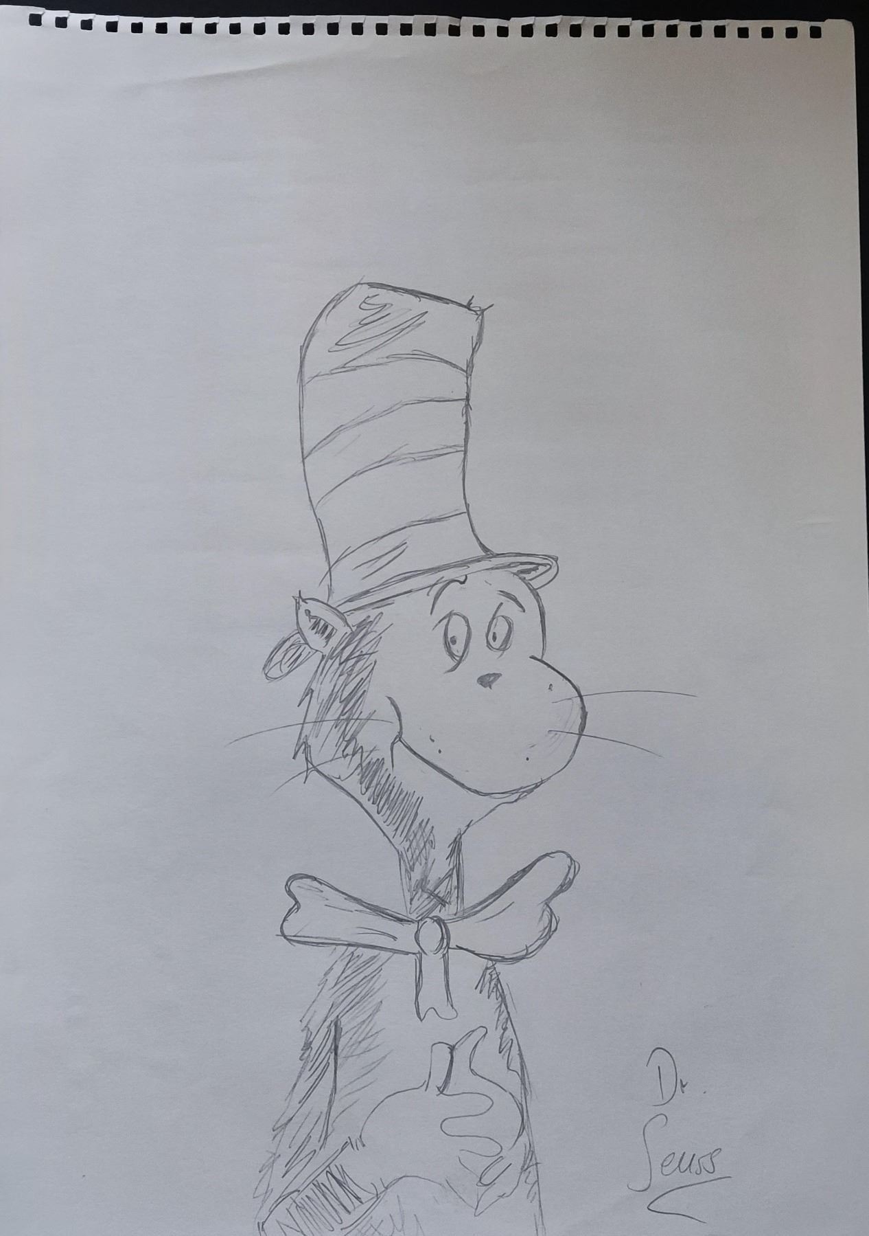 This is a large drawing of the cat in the hat in pencil on A3 art paper. Signed to the right hand side Dr Seuss. Supplied with coa.