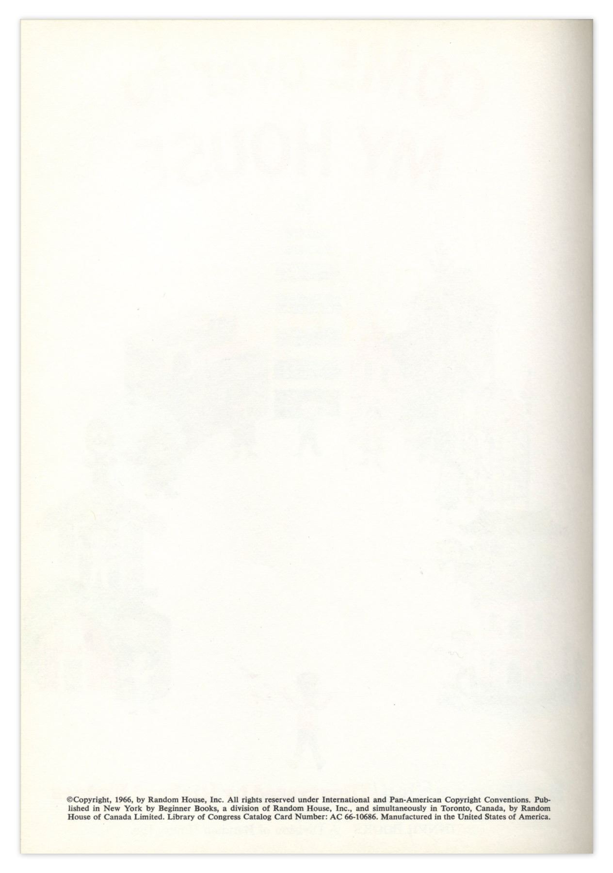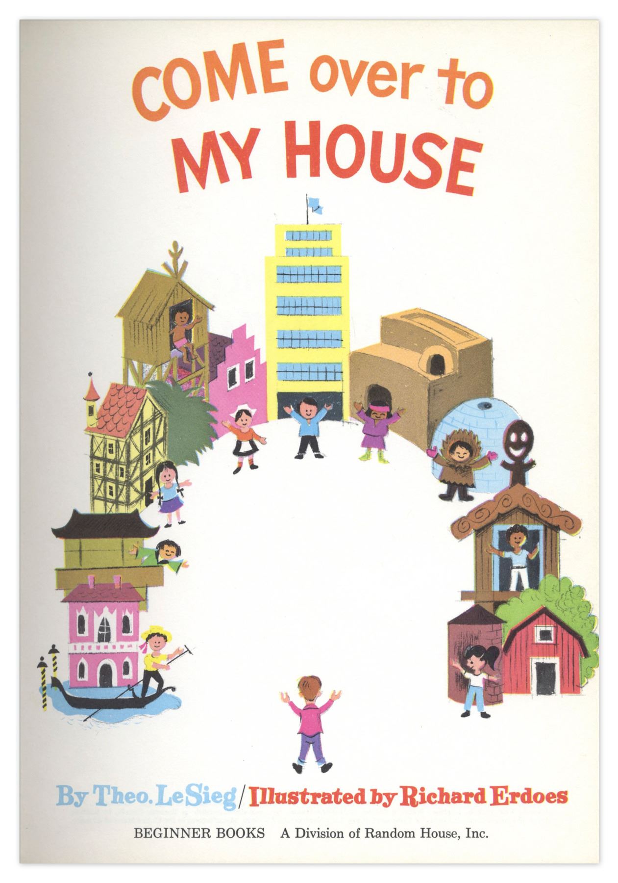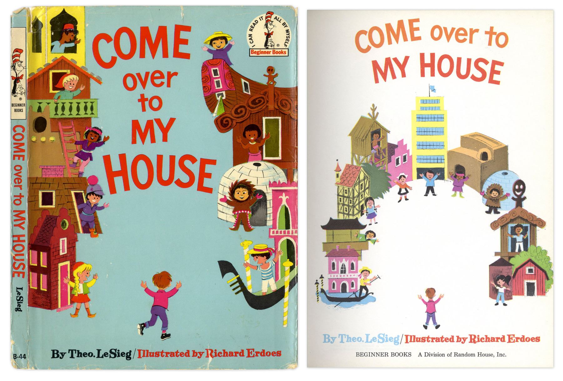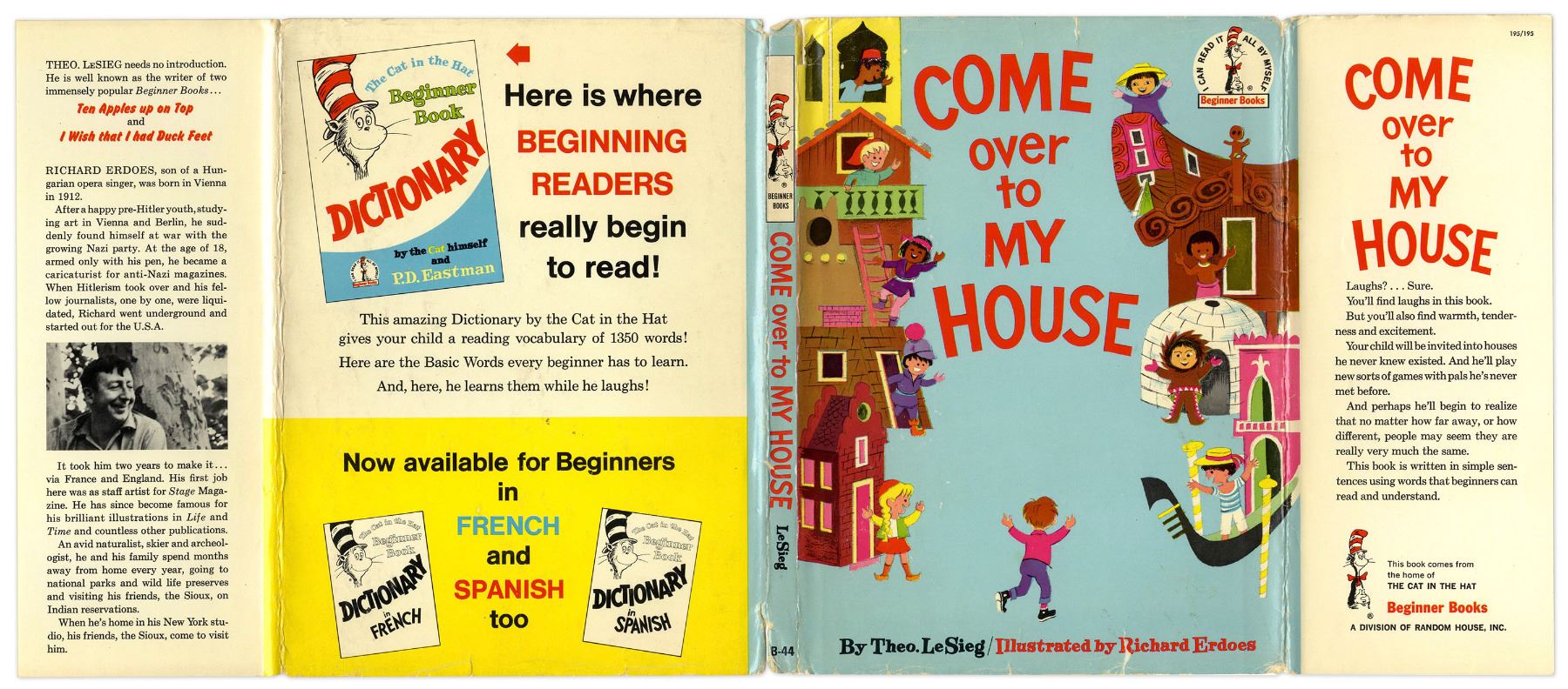 First edition, first printing of ''Come Over to My House'', written by Dr. Seuss under his pen-name, Theo LeSieg, which he used when others illustrated his work. Illustrated by Richard Erdoes in full color, book portrays the various styles of homes that children from around the world live in, told in Seuss' quirky verbiage. Random House: New York: 1966. Original dust jacket, with unclipped 195/195 price, has minor wear to edges, else very good. Book, measuring 6.5'' x 9.5'', is in near fine condition.