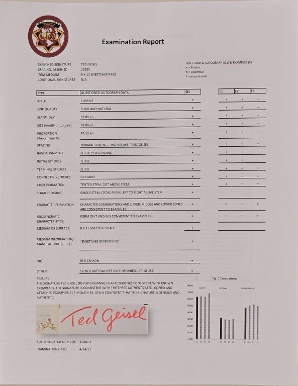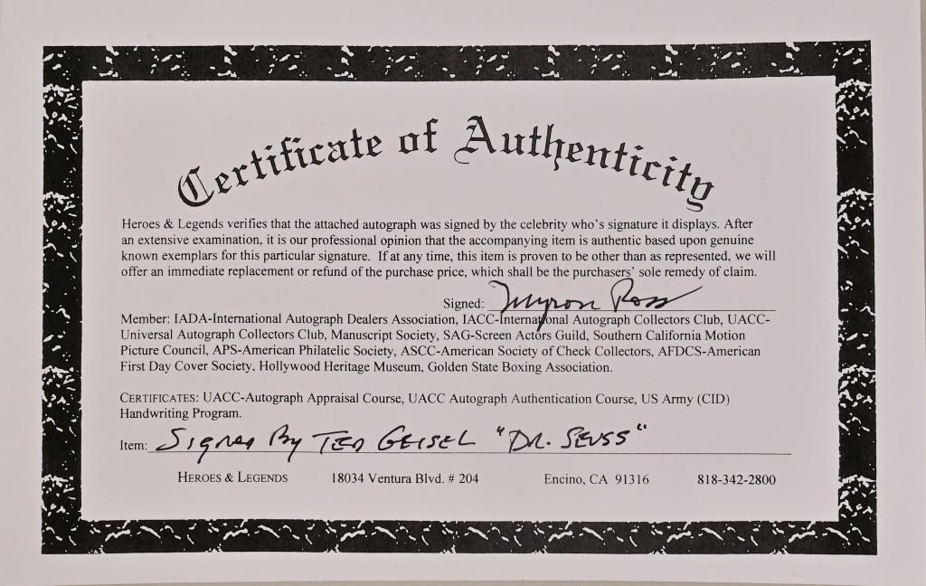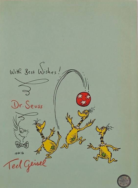 Dr. Seuss double signed print. GFA authenticated. Signed as Dr. Seuss and again as Ted Geisel. 8x11 inches. GFA authenticated. PSJ79