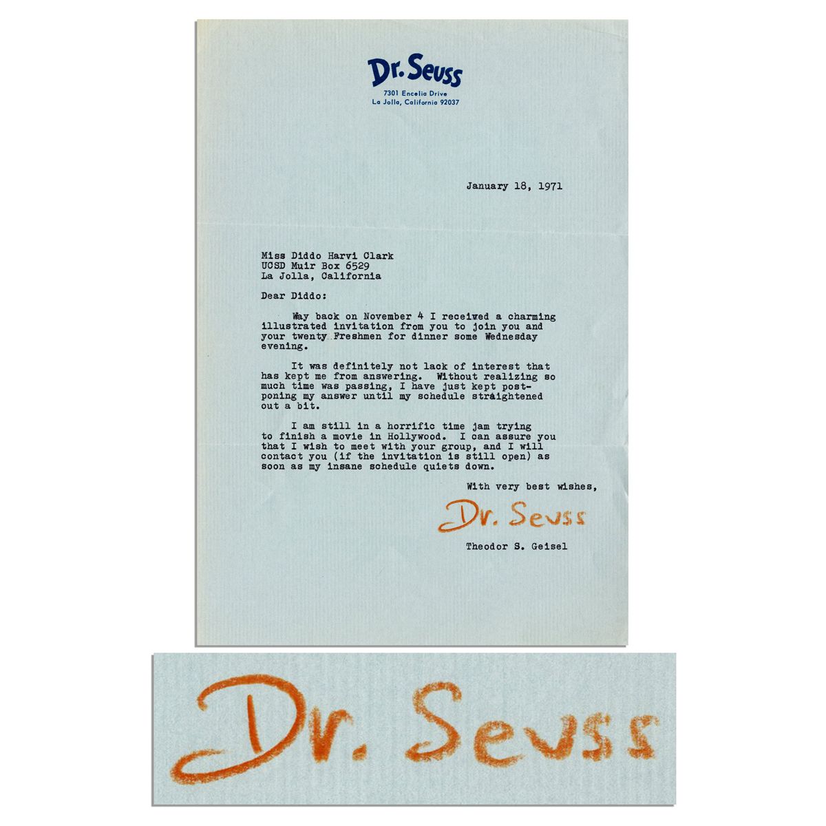 Dr. Seuss typed letter signed, dated 18 January 1971. Addressed to Diddo Clark upon his personal stationery, letter reads in part: ''Dear Diddo, Way back on November 4 I received a charming illustrated invitation from you to join you and your twenty Freshmen for dinner...I am still in a horrific time jam trying to finish a movie in Hollywood. I can assure you that I wish to meet with your group, and I will contact you (if the invitation is still open) as soon as my insane schedule quiets down. With very best wishes, [signed in orange crayon] Dr. Seuss''. Single page measures 7'' x 10.5''. Creasing and light toning, else near fine.