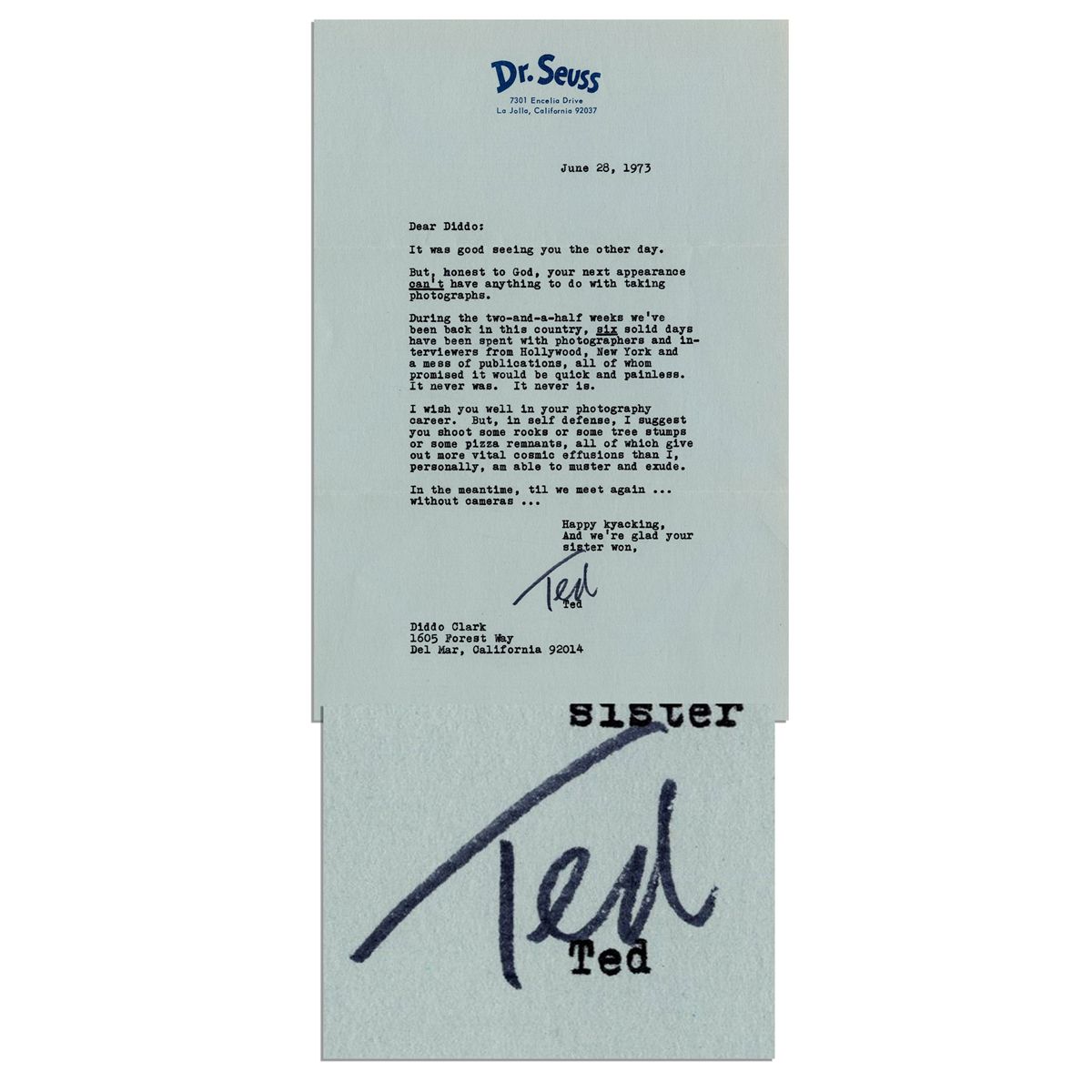 An emphatic typed letter signed by Dr. Seuss, regarding not being photographed. He writes upon his personal stationery to his friend Diddo Clark; dated 28 June 1973, letter reads in full: ''Dear Diddo: It was good seeing you the other day. But, honest to God, your next appearance [underscored] can't have anything to do with taking photographs. During the two-and-a-half weeks we've been back in this country, [underscored] six solid days have been spent with photographers and interviewers from Hollywood, New York, and a mess of publications, all of whom promised it would be quick and painless. It never was. It never is. I wish you well in your photography career. But, in self defense, I suggest you shoot some rocks or some tree stumps or some pizza remnants, all of which give out more vital cosmic effusions than I, personally, am able to muster and exude. In the meantime, til we meet again... without cameras... Happy kyaking [sic] And we're glad your sister won, [signed] Ted''. 1pp. with original envelope measures 7'' x 10.25''. Ink notation to verso and creasing, else near fine.