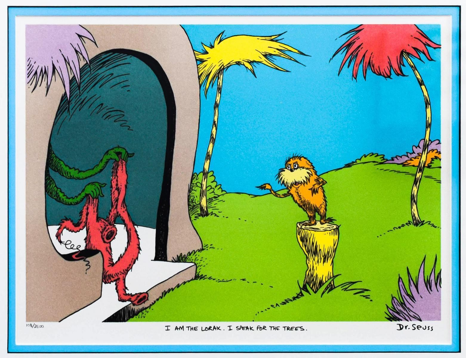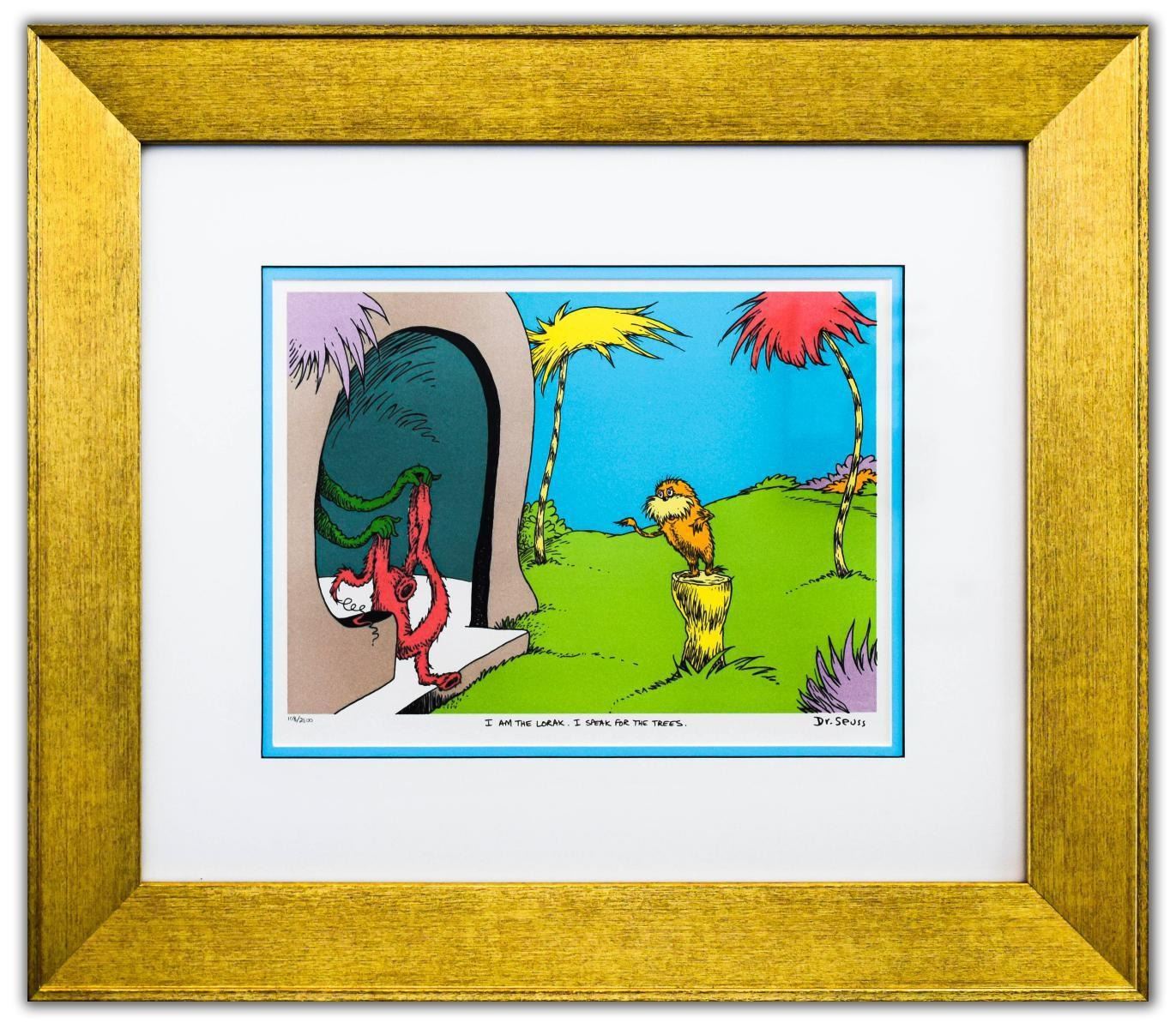 Artist: Dr. Seuss. Medium: Lithograph on B.F.K. Rives Paper. Title: I AM THE LORAX, I SPEAK FOR THE TREES. Size (Unframed): 12" x 16". Size (Framed): 20" x 23". Limited Edition: Edition of 2500. Certificate of Authenticity: From the publisher. Additional: Custom Framed. Reference# 13280.