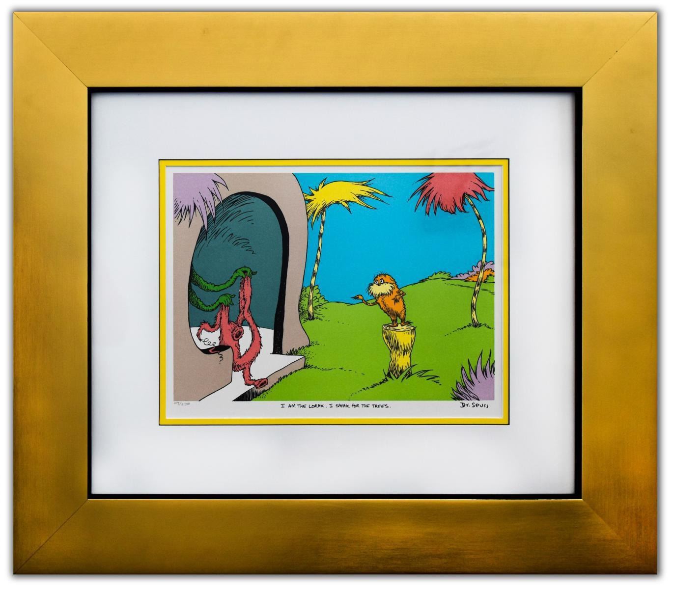 Artist: Dr. Seuss. Medium: Lithograph on B.F.K. Rives Paper. Title: I AM THE LORAX, I SPEAK FOR THE TREES. Size (Unframed): 12" x 16". Size (Framed): 21" x 24". Limited Edition: Edition of 2500. Certificate of Authenticity: From the publisher. Additional: Custom Framed. Reference# 13277.