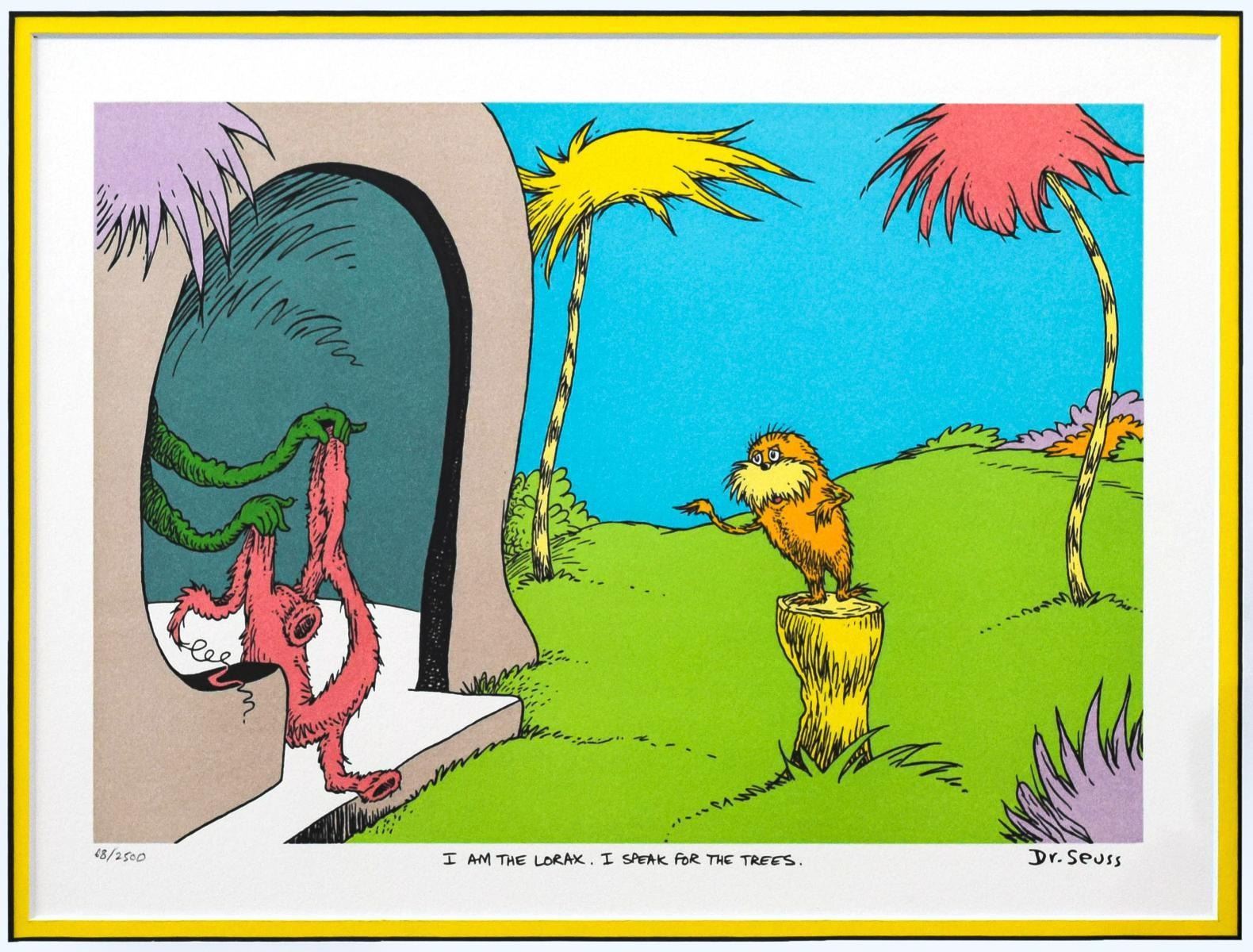 Artist: Dr. Seuss. Medium: Lithograph on B.F.K. Rives Paper. Title: I AM THE LORAX, I SPEAK FOR THE TREES. Size (Unframed): 12" x 16". Size (Framed): 18" x 22". Limited Edition: Edition of 2500. Certificate of Authenticity: From the publisher . Additional: Custom framed. Reference# 15188.