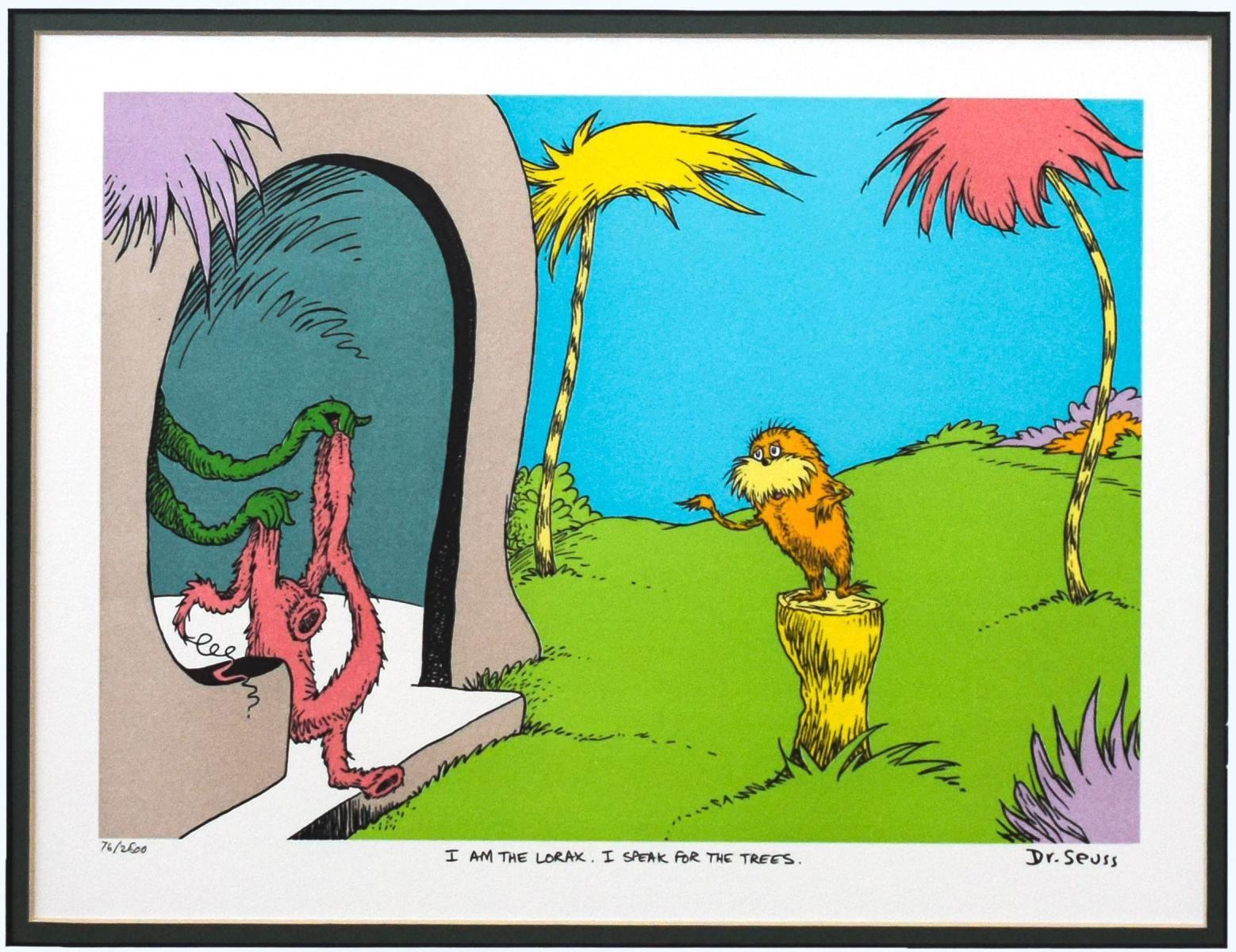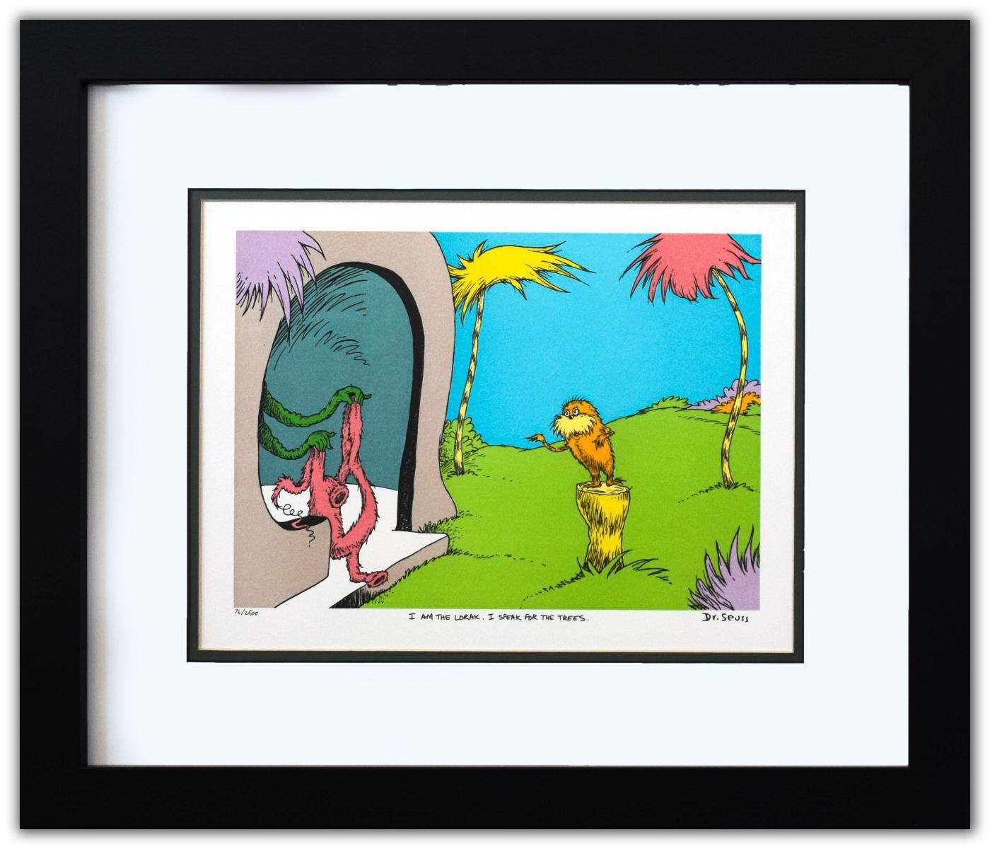 Artist: Dr. Seuss. Medium: Lithograph on B.F.K. Rives Paper. Title: I AM THE LORAX, I SPEAK FOR THE TREES. Size (Unframed): 12" x 16". Size (Framed): 18" x 22". Limited Edition: Edition of 2500. Certificate of Authenticity: From the publisher . Additional: Custom framed. Reference# 15189.