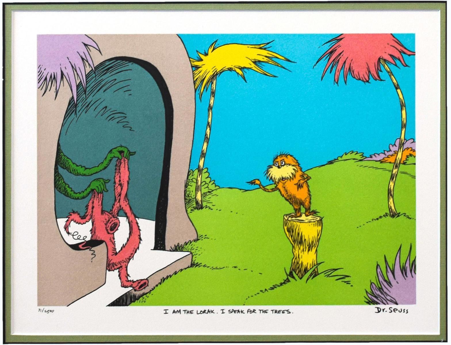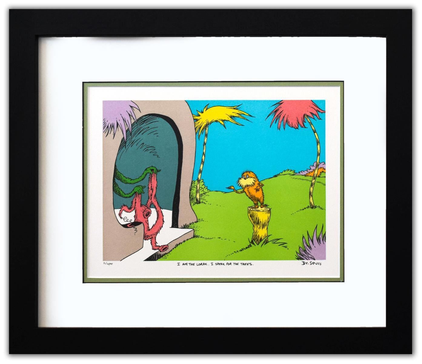 Artist: Dr. Seuss. Medium: Lithograph on B.F.K. Rives Paper. Title: I AM THE LORAX, I SPEAK FOR THE TREES. Size (Unframed): 12" x 16". Size (Framed): 18" x 22". Limited Edition: Edition of 2500. Certificate of Authenticity: From the publisher . Additional: Custom framed. Reference# 15190.