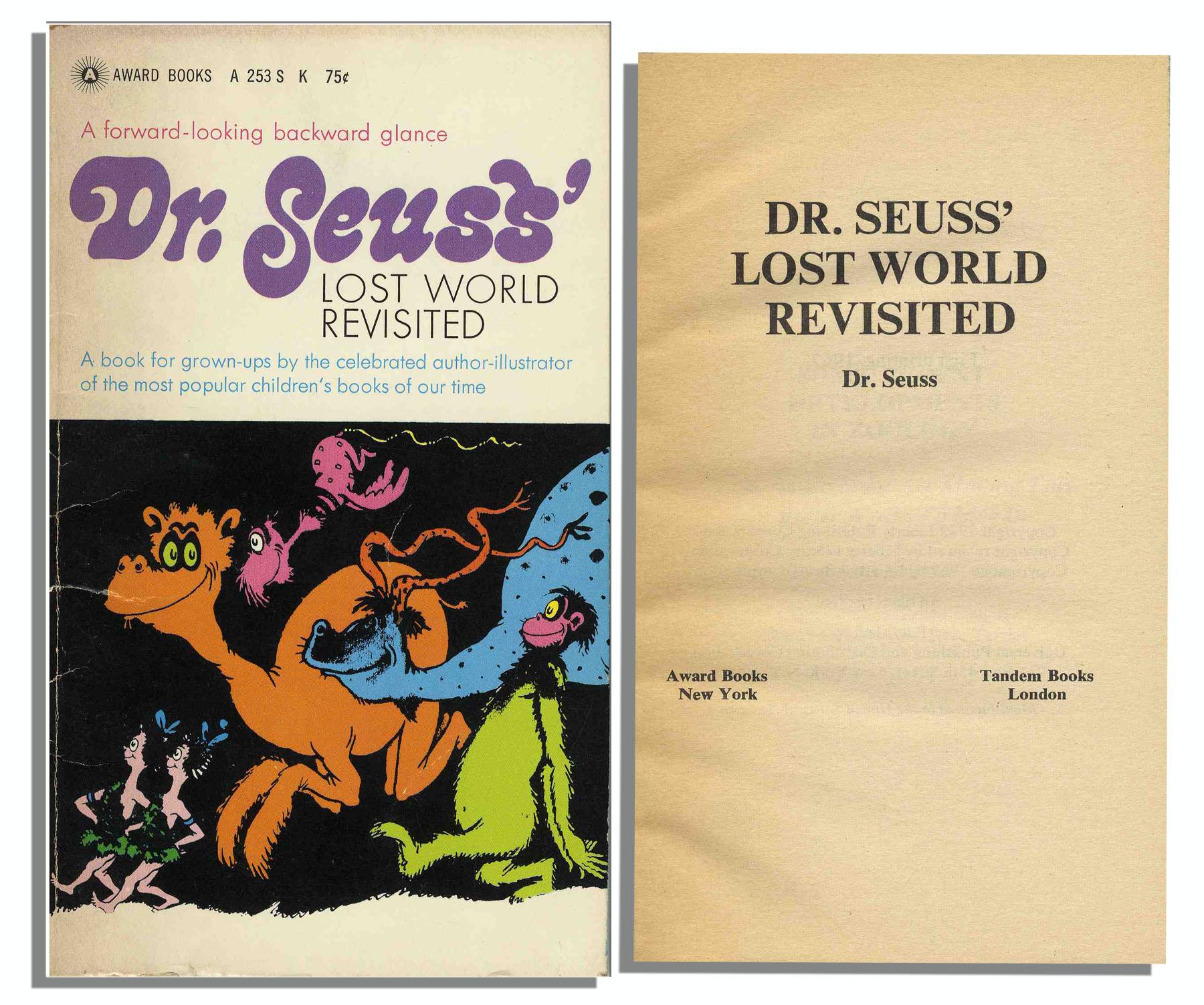 First edition, first printing of Dr. Seuss' ''Lost World Revisited,'' a nonsensical paperback original book for adults by the celebrated author-illustrator, with illustrations throughout. Award Books: New York: 1967. With ''First Printing 1967'' on copyright page. Book, measuring 4.25'' x 7'', has three 1'' tears from creasing at spine on front board and a turquoise ink tinge to tail, fore and top edges, else very good condition.