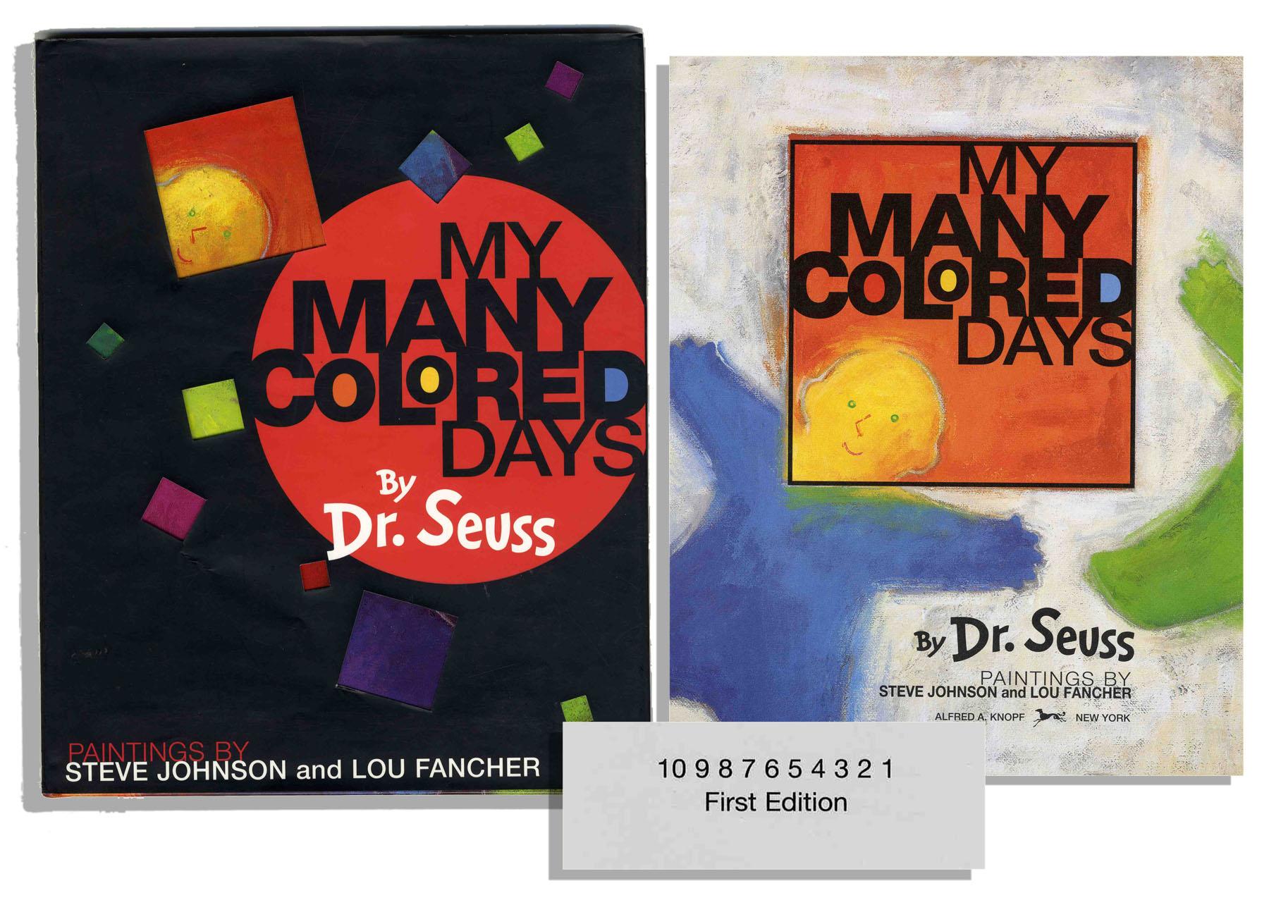 Dr. Seuss ''My Many Colored Days'' first edition, first printing, published after Seuss' death in 1991, with colorful painting illustrations by Steve Johnson and Lou Fancher. Knopf: New York: 1996. All first edition points present, with complete number code of 10-0 and ''first edition'' stated on last page of book. Black dustjacket has minor rubbing, with original unclipped $16.00 price. Book measures 8.5'' x 11'', with colorful glazed paper over boards. Near fine condition.