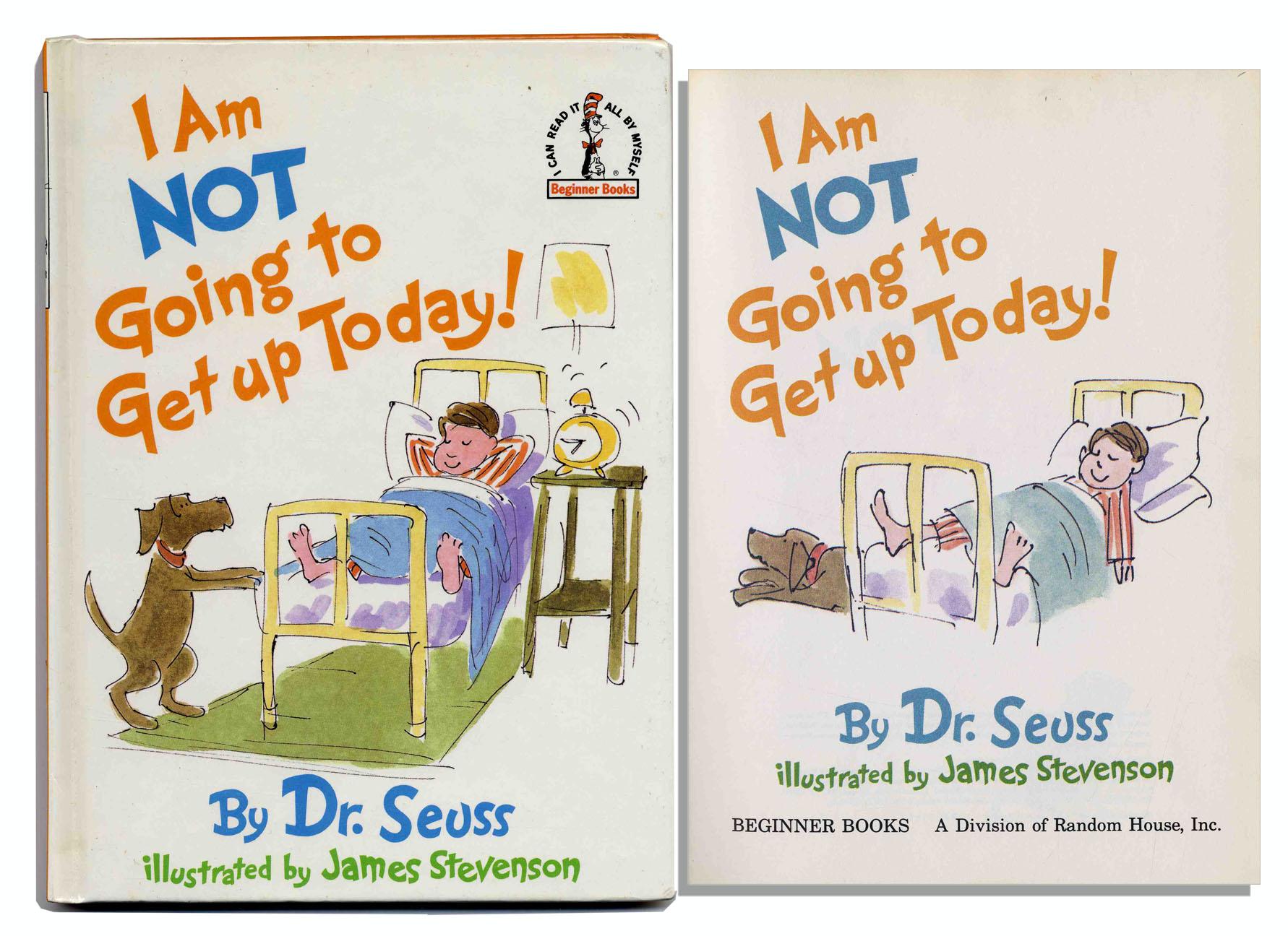First edition, first printing of ''I Am Not Going to Get Up Today!'' written by Dr. Seuss and illustrated by James Stevenson. Random House: New York: 1987. With first edition code printed on copyright page. In this every child's fantasy, a boy takes charge of his own destiny on this particular morning, refusing to get out of bed -- told in a signature Dr. Seussian whimsical way. Book, measuring 6.25'' x 9.25'', has no dustjacket as issued. In fine condition.