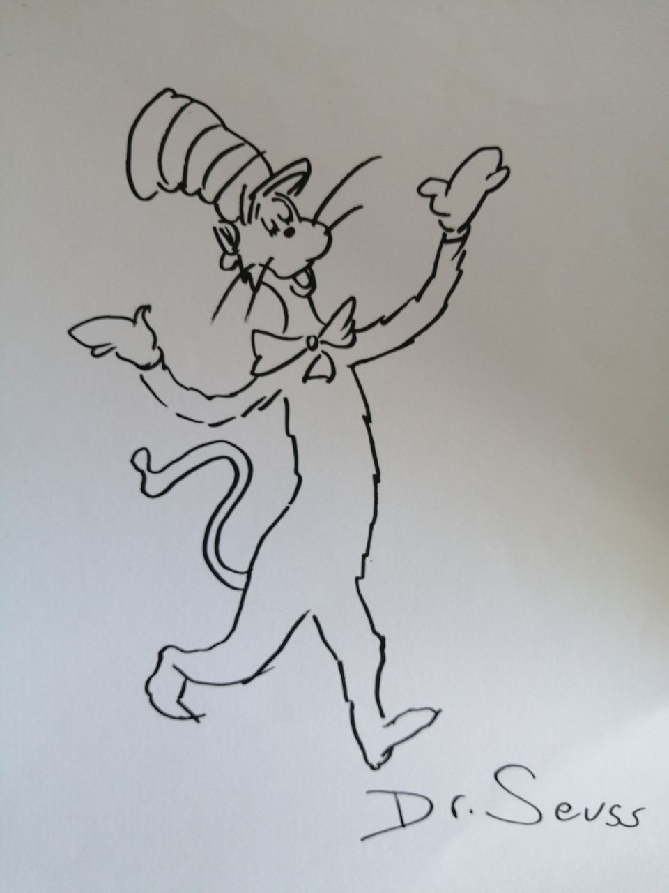 Theodor Seuss Geisel's artwork became the platform from which he delivered forty-four children's books, more than 400 World War II political cartoons, hundreds of advertisements, and countless editorials filled with wonderfully inventive animals, characters, and humor. Here is a drawing of his most favourite character 'The Cat in the hat' drawn and signed by Theodor Seuss Geisel. Mounted, framed and supplied with coa.
