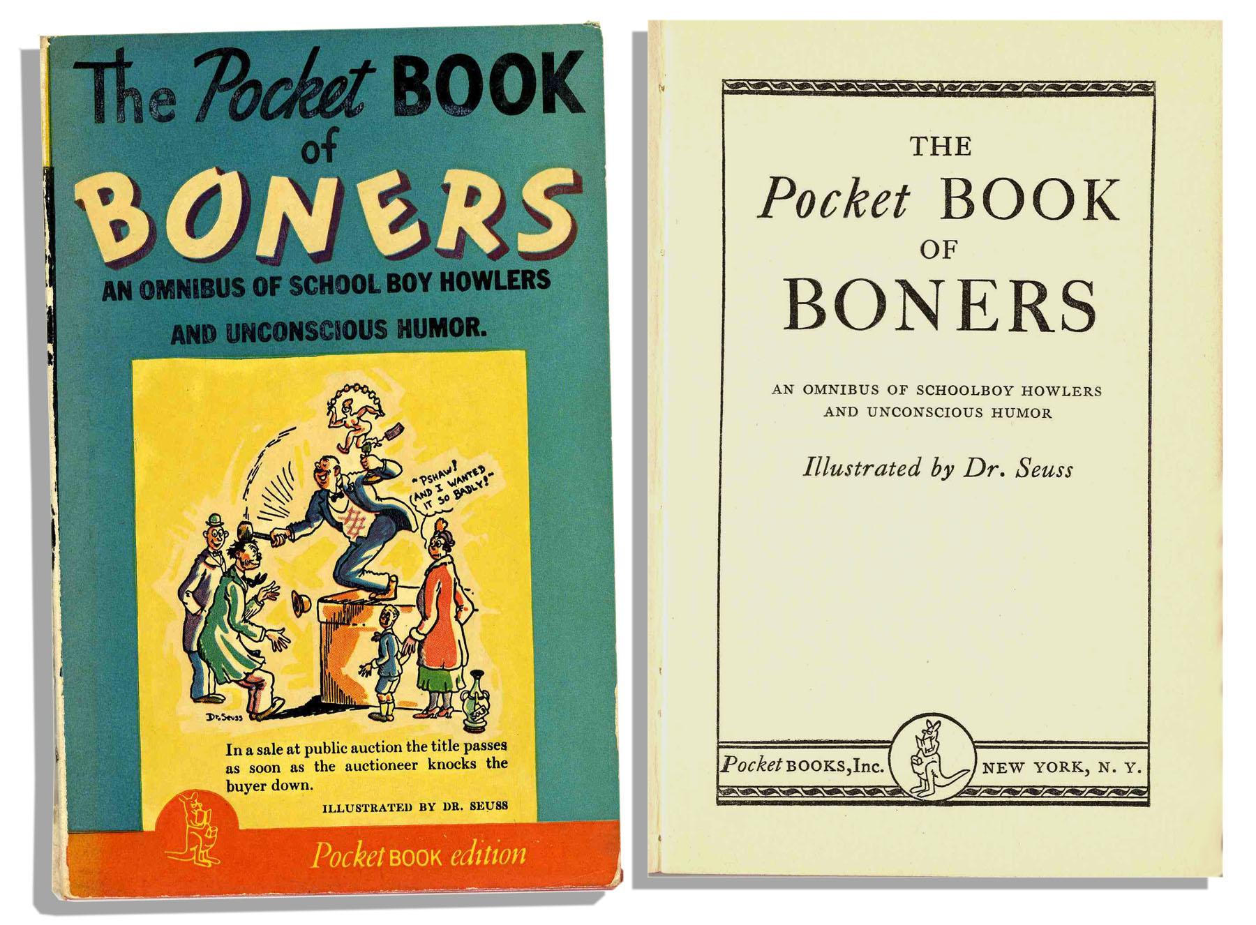 Very early edition of ''Pocket Book of Boners: An Omnibus of School Boy Howlers and Unconscious Humor,'' an adult humor book illustrated by Dr. Seuss. Pocketbooks: New York: 1941. Paperback book, measuring 4.25'' x 6.5'', runs 120pp. with minor rubbing to spine and small crease on back cover. Red ink tinge to tail, fore and top edges. Book is signed by previous owner on front pastedown. Very good condition overall.
