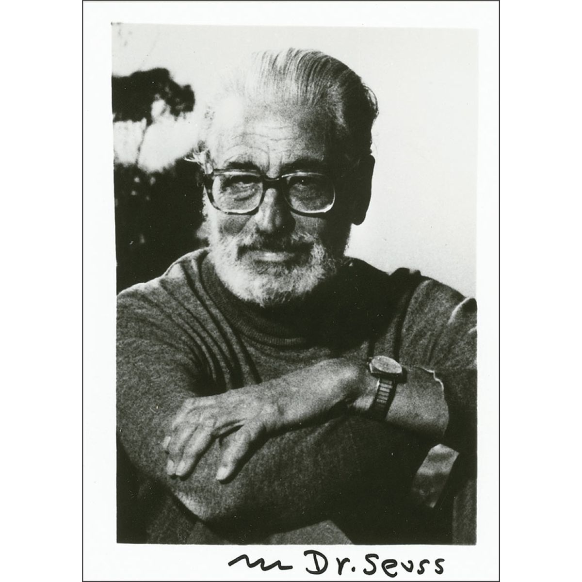 Dr. Seuss signed photo of himself. Glossy black and white photo measures 3.75'' x 5'', signed in black felt tip along the bottom white margin. Fine condition.