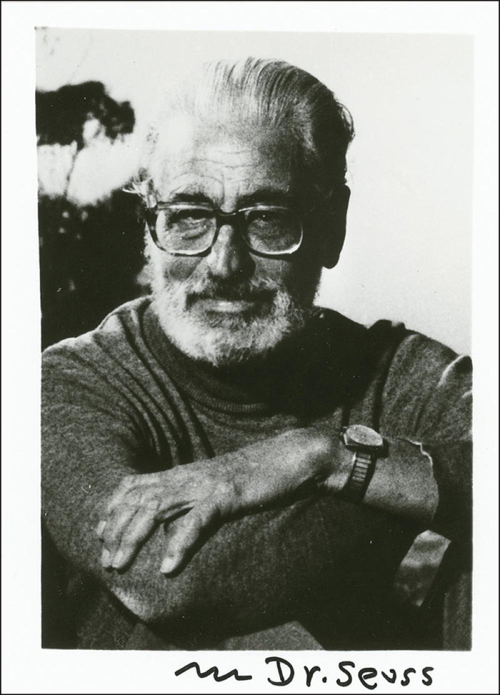 Dr. Seuss signed photo of himself. Glossy black and white photo measures 3.75'' x 5'', signed in black felt tip along the bottom white margin. Fine condition.