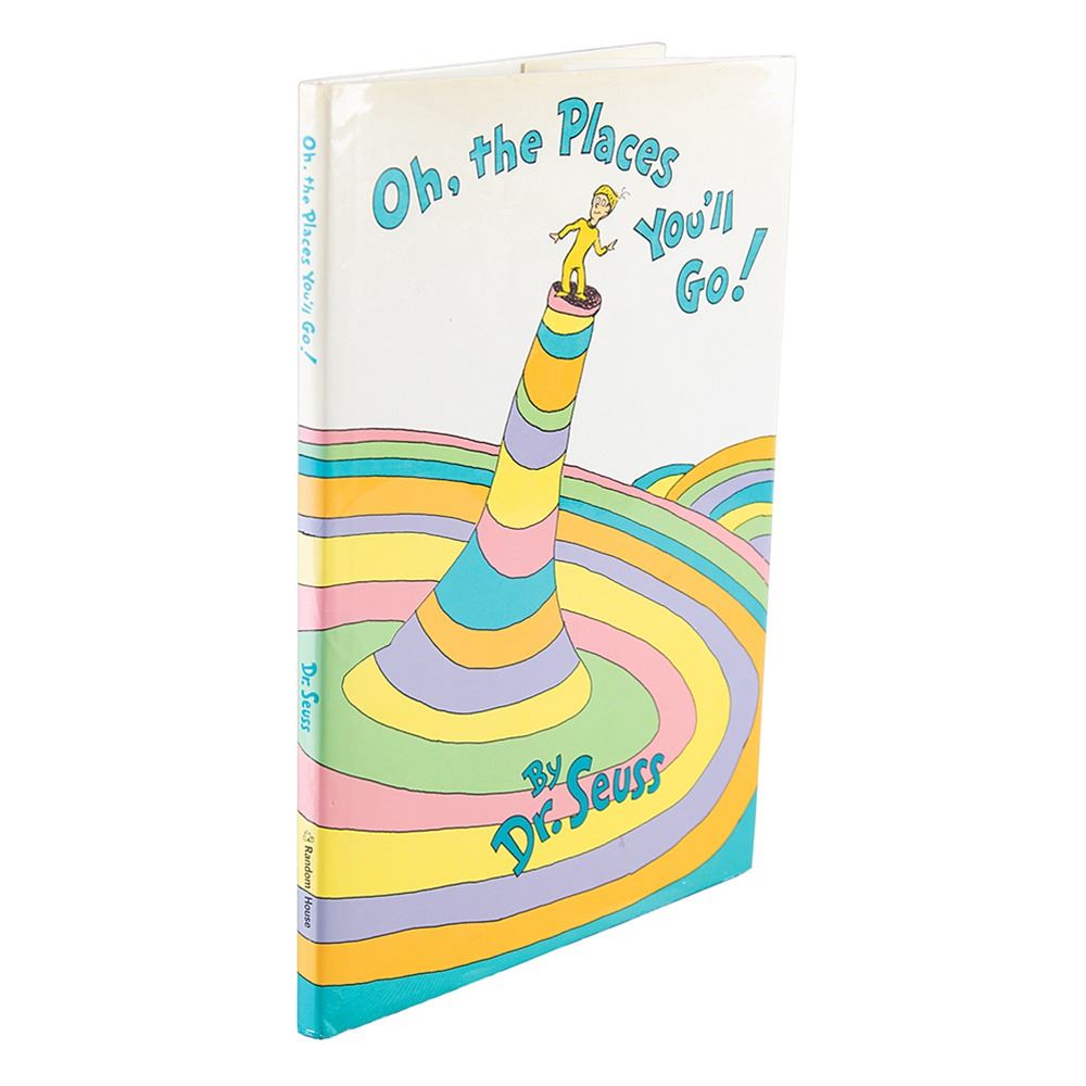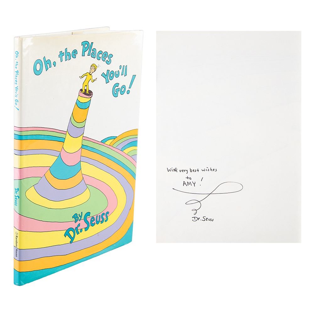Signed book: Oh, the Places You'll Go! First edition. NY: Random House, 1990. Hardcover with dust jacket, 8.25 x 11.25, 44 pages. Signed and inscribed adjacent to the half-title page in black ink, "With very best wishes to Amy! Dr. Seuss." Autographic condition: fine, with a tiny stain to extreme top edge. Book condition: VG+/VG+, with a tiny stain to the top edge of the textblock, slightly bumped corners, a soft diagonal crease to the front dust jacket flap, and some very subtle toning and soiling to the jacket.