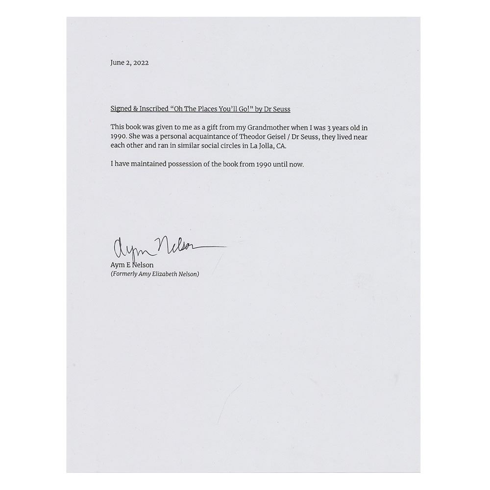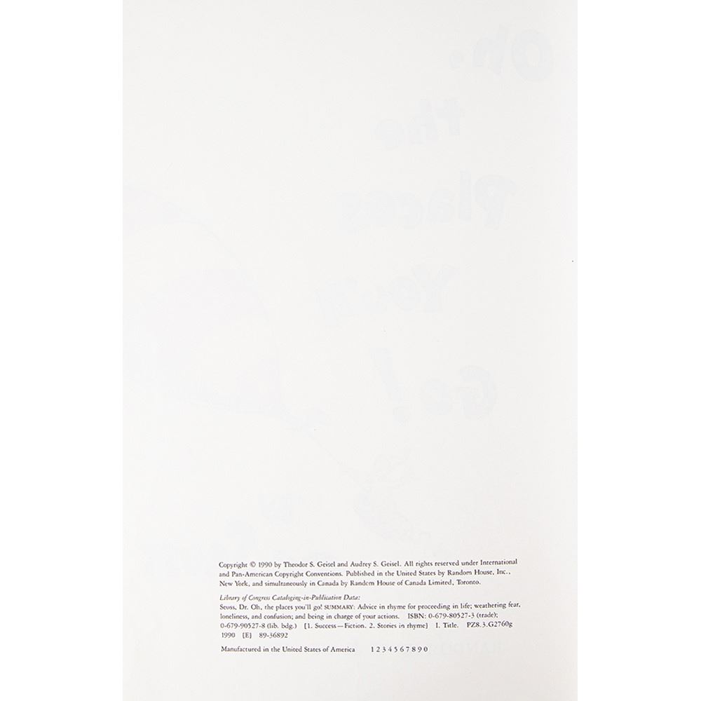 Although unconfirmed, it remains highly unlikely that the author performed any public book signings for Oh, the Places You'll Go!, his final book, given that he had experienced complications from his oral cancer prior to the book's release date on January 22, 1990; Dr. Seuss would lose his battle with cancer at the age of 87, on September 24, 1991. Signed examples of Oh, the Places You'll Go!, the last Seuss book to be published during his lifetime, are virtually nonexistent, with RR Auction having sold one other last June; prior to that, our research reveals that no other example had sold at auction within the past 15 years.