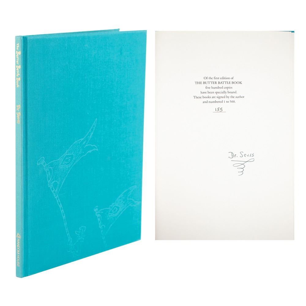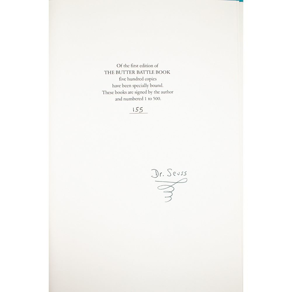 Signed book: The Butter Battle Book. First edition, limited issue, numbered 155/500. NY: Random House, 1984. Hardcover with slipcase, 8.25 x 11.25. Signed on the colophon in black ink, "Dr. Seuss." In fine condition, with faint sunning to the spine and slipcase.