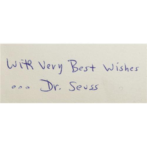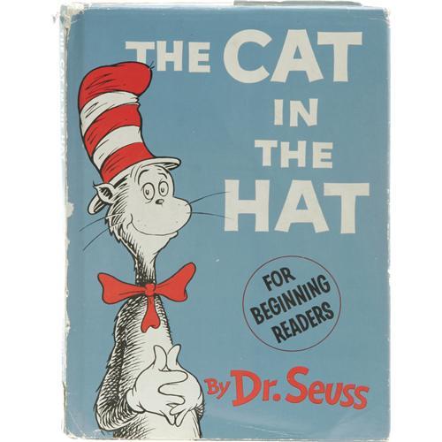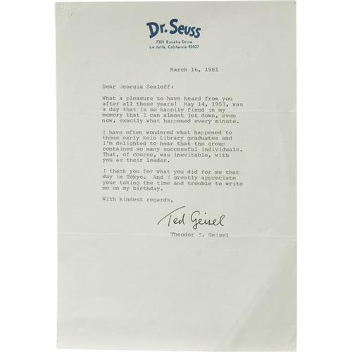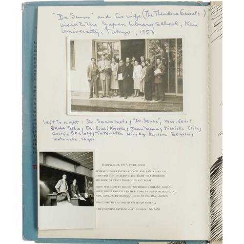 <B>Dr. Seuss Signed Association Copy:<I> The Cat in the Hat</B></I> With Typed Letter Signed.</B></I> Includes a first edition, later state copy of the classic <I>The Cat in the Hat</B></I> (New York: Random House, 1957), 61 pages, signed by Seuss on the verso of the ffep "<I>With very best wishes…Dr. Seuss</B></I>", illustrated by the author, uncoated pictorial boards, 8vo (7" x 9.25"), very good in a slightly chipped jacket with no price printed on the front flap. This is the personal copy of Georgia Sealoff who was associated with Ted "Dr. Seuss" Geisel through the Japan Library School at Keio University, Tokyo. Sealoff has pasted a black and white photo of Geisel's 1953 visit to the school on the copyright page and annotated it with the names of the individuals in the group shot including Geisel and his wife. Accompanying the book is a one page typed letter on Dr. Seuss letterhead, dated March 16, 1981 signed "<I>Ted Geisel</B></I>" in which he thanks Ms. Sealoff for her thoughtful letter marking his birthday. He also fondly reminisces about his visit to Keio University nearly thirty years before. The letter has a thumbtack hole in the upper left corner and has been folded, else fine with the accompanying envelope.<BR><BR><b>Shipping:</b> Books & Catalogs (<a target="_blank" href="http://www.heritageauctions.com/common/shipping.php">view shipping information</a>)