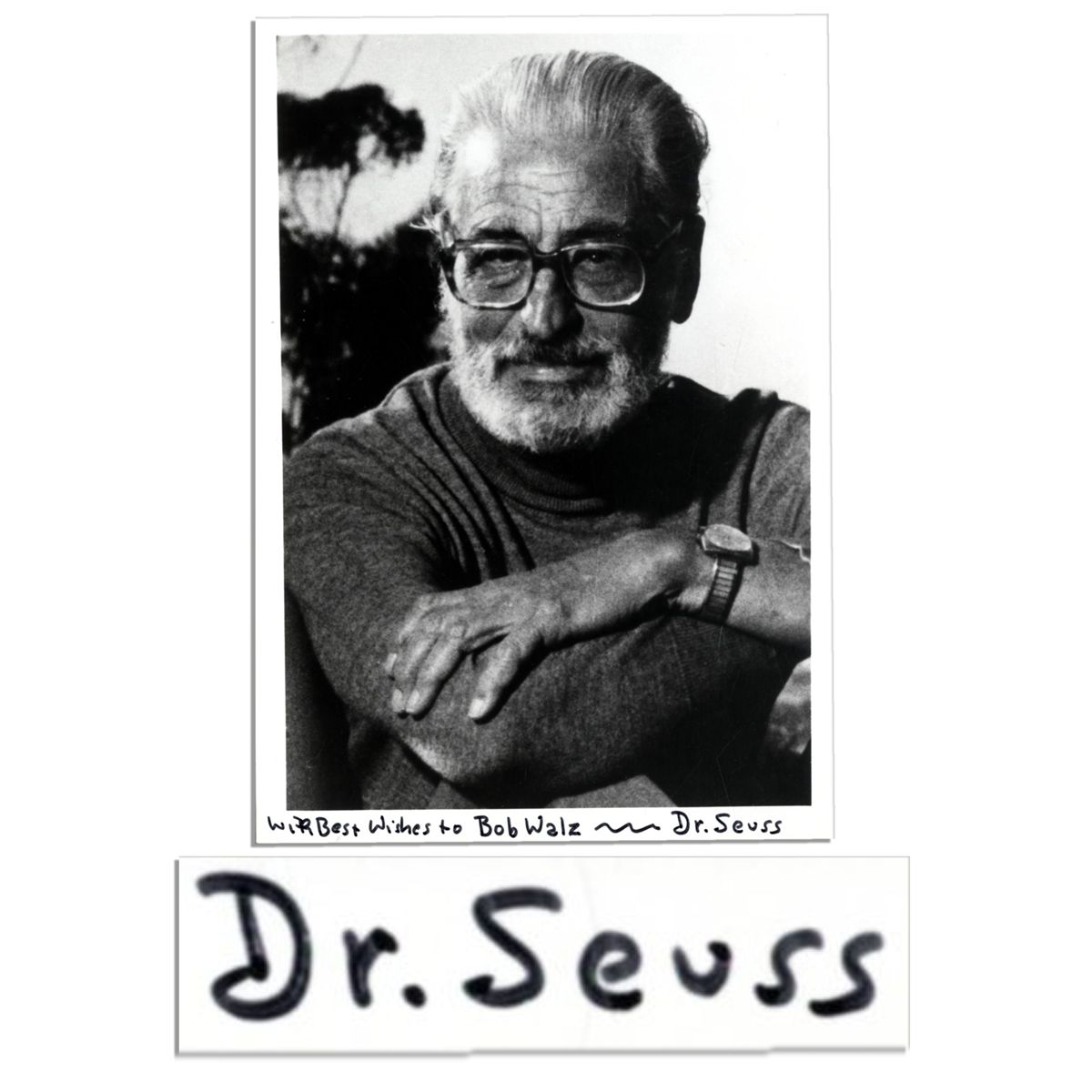 Acclaimed and wildly popular children's book author Dr. Seuss signs and inscribes the border of a photo portrait of himself in black felt tip: ''With Best Wishes to Bob Walz ~~ Dr. Seuss''. Measures 5'' x 7.25''. Light creasing, else near fine.