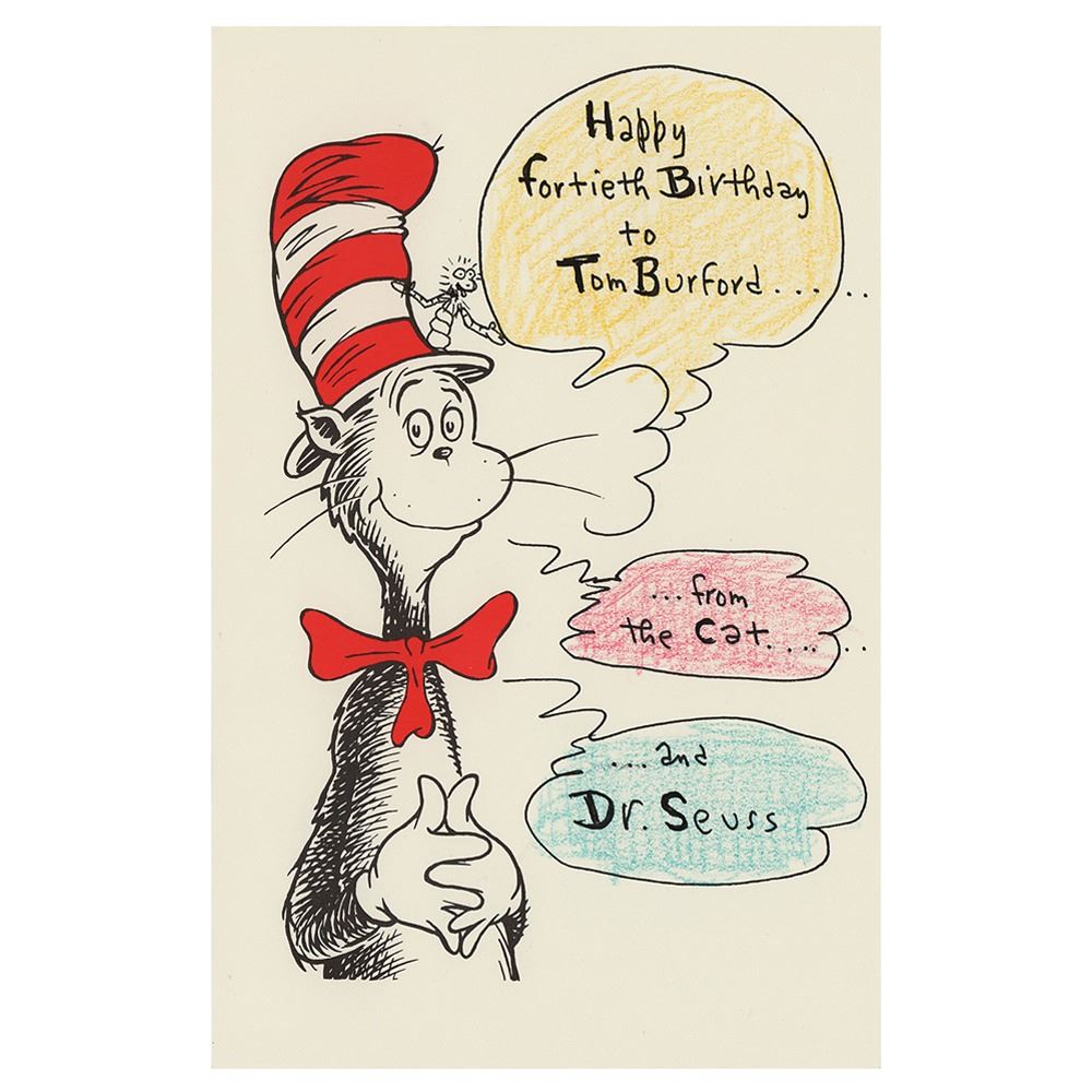 Color 5.5 x 8.5 print of the Cat in the Hat, signed and inscribed in black ink in three speech bubbles, “Happy fortieth Birthday to Tom Burford…,†“…from the cat…,†and “…and Dr. Seuss,†who has colored the speech bubbles with crayon and has added a small sketch of a worm-like creature seated on the brim of the iconic red-and-white-striped top hat. In very fine condition.