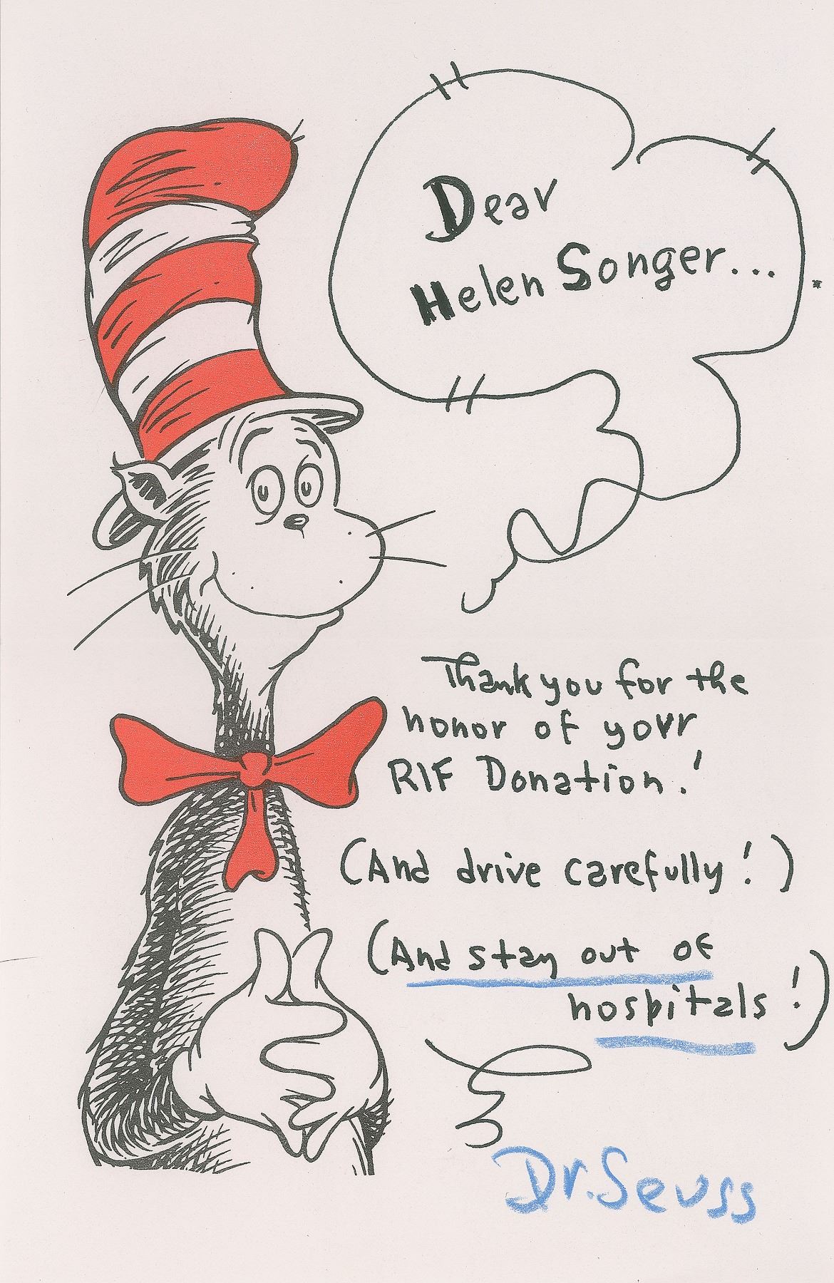 Color 5.5 x 8.5 print of the Cat in the Hat, inscribed in black felt tip, "Dear Helen Songer…Thank you for the honor of your RIF Donation! (And drive carefully!) (And stay out of hospitals!)," and signed below in blue crayon, "Dr. Seuss." In fine condition, with a very light central vertical fold. Accompanied by the original mailing envelope.