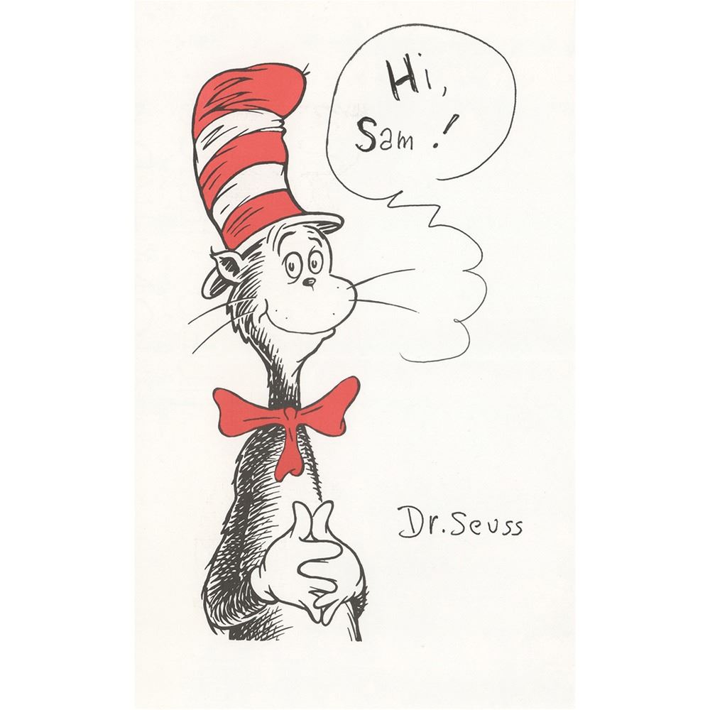 Color 5.25 x 8.5 print of the Cat in the Hat, signed and inscribed in black felt tip, "Hi Same! Dr. Seuss." In fine condition, with a light horizontal fold.