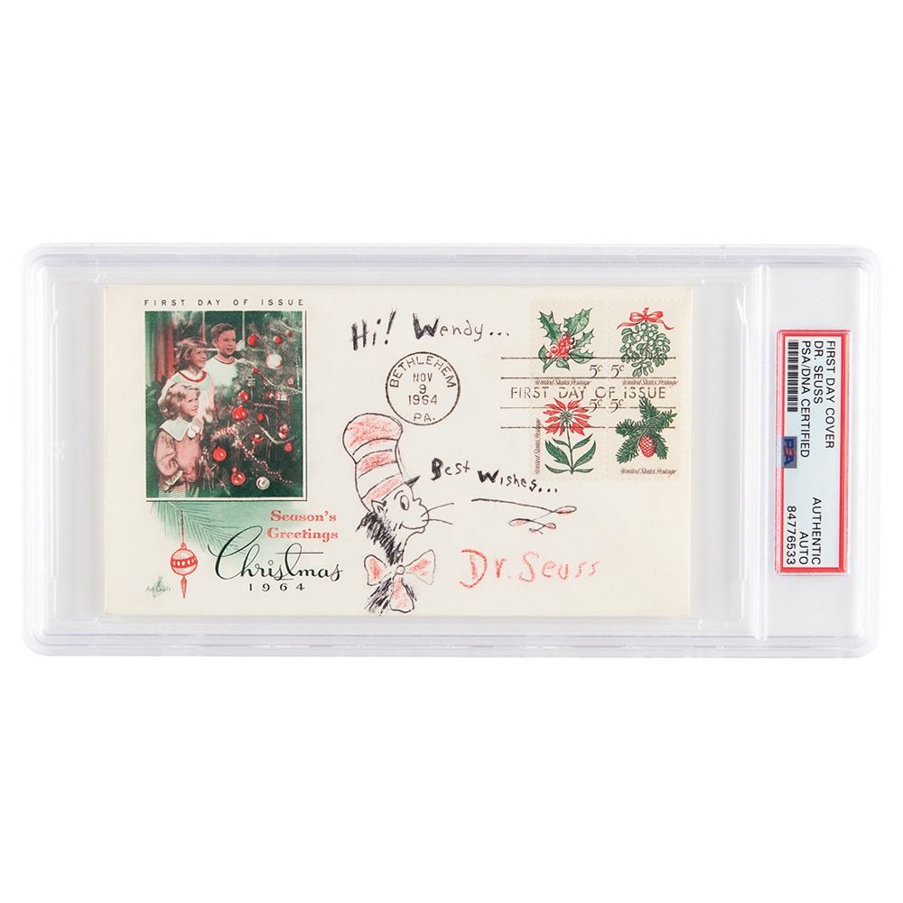 Original ink and crayon sketch of the Cat in the Hat on an off-white First Day Cover with a cachet honoring Christmas 1964, signed and inscribed, "Hi! Wendy…Best wishes…Dr. Seuss." In fine condition. Encapsulated in a PSA/DNA authentication holder.
