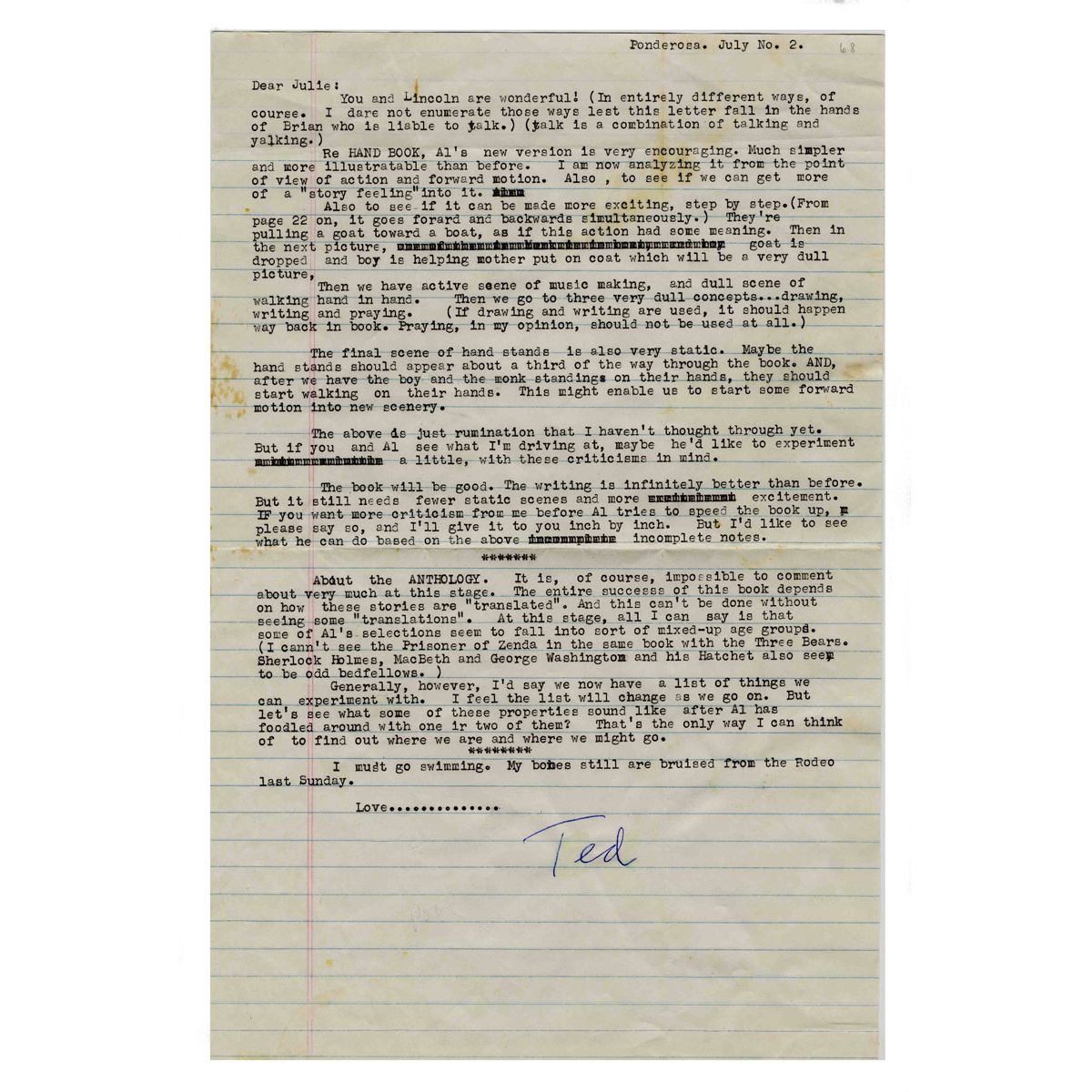 Interesting typed letter signed by Dr. Seuss dated ''July No. 2.'' Seuss writes to his former editor with lengthy comments about two children's books: ''…Re HAND BOOK, Al's new version is very encouraging. Much simpler and more illustratable [sic] than before. I am now analyzing it from the point of view of action and forward motion. Also, to see if we can get more of a 'story feeling' into it. Also to see if it can be made more exciting, step by step. (From page 22 on, it goes forard [sic] and backwards simultaneously.) They're pulling a goat toward a boat, as if this action had some meaning. Then in the next picture, goat is dropped and boy is helping mother put on coat which will be a very dull picture, Then we have active scene of music making, and dull scene of walking hand in hand. Then we go to three very dull concepts…drawing writing and praying. (If drawing and writing are used, it should happen way back in book. Praying, in my opinion, should be not used at all.) The final scene of hand stands is also very static. Maybe…after we have the boy and the monk standing on their hands, they should start walking on their hands. This might enable us to start some forward motion into new scenery. The above is just rumination that I haven't thought through yet…IF you want more criticism from me before Al tries to speed the book up, please say so, and I'll give it to you inch by inch…'' Seuss then continues to critique a second book and signs off with, ''I must go swimming. My bones still are bruised from the Rodeo last Sunday. Love……. Ted''. Single page letter in very good condition measures 8.25'' x 12.75''. An exceptional letter on telling stories from the master of story telling.