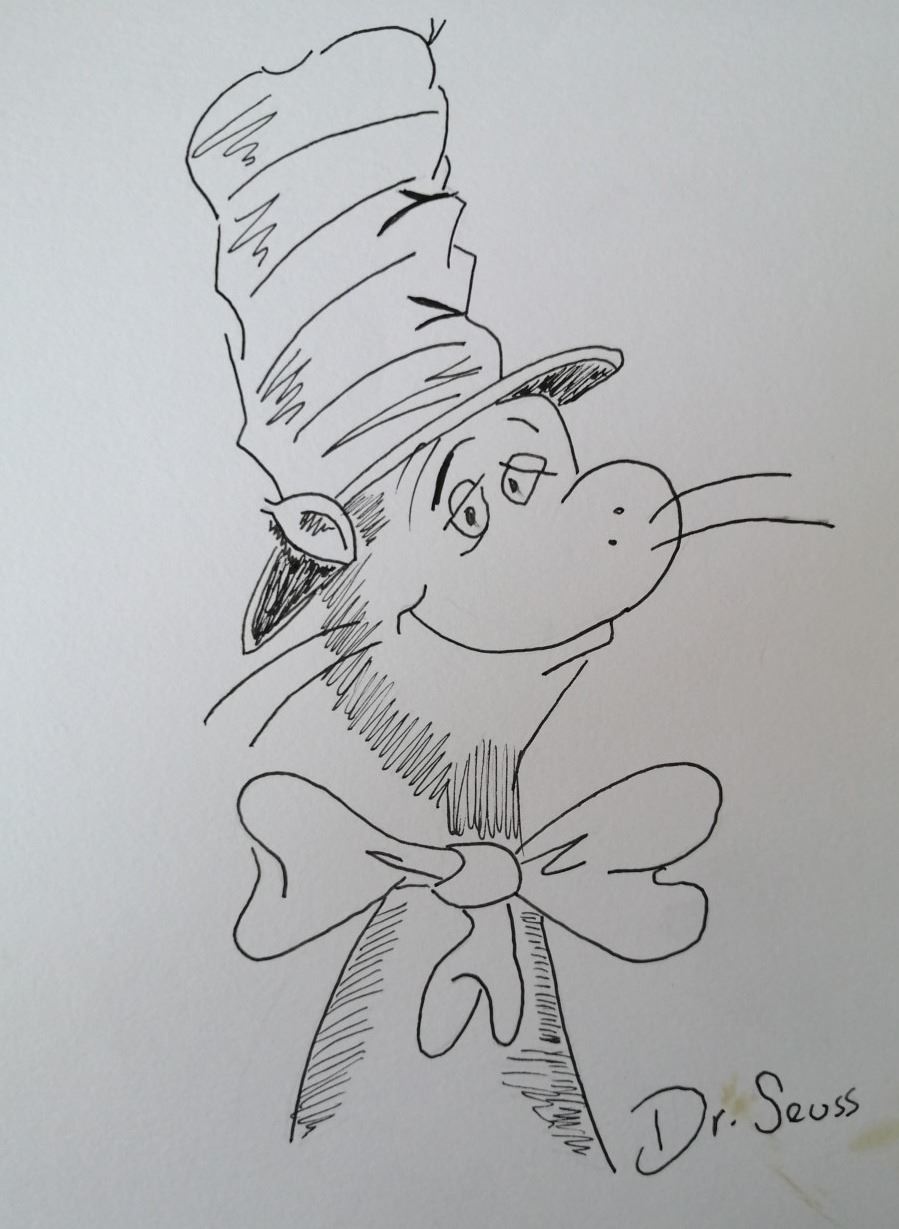 DR. SEUSS B. THEODOR GEISEL (1904-1991). The Cat in the Hat, ink on card. Image: 11.25x8.25 inches. Signed by Dr Seuss. Some marks over Dr Seuss signature. Supplied with coa.
