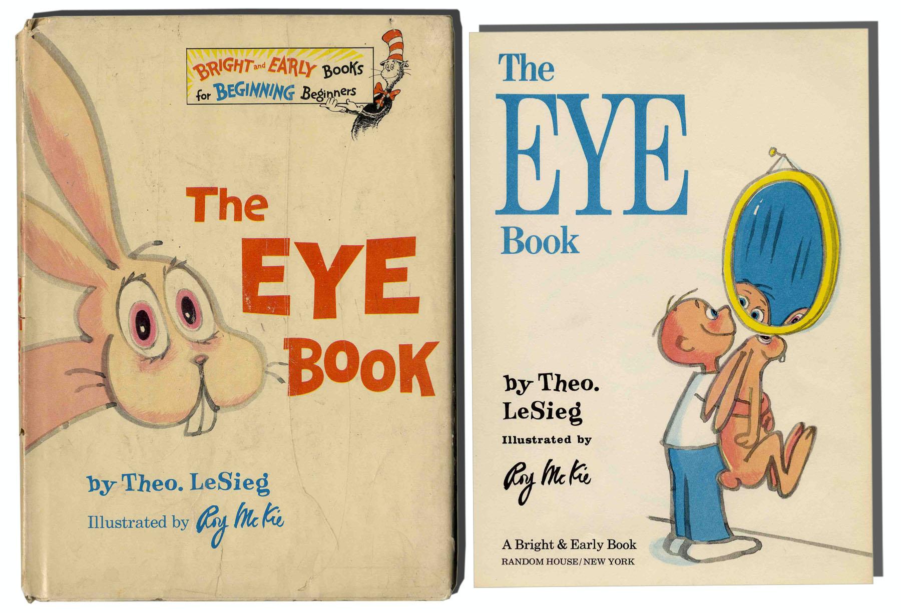 First edition, first printing of ''The Eye Book,'' written by Dr. Seuss under his pen-name, Theo LeSieg, which he used when others illustrated his work. Illustrated by Roy McKie in full color, book is a humorous ode to eyes as told best by the master of whimsy, Dr. Seuss. Random House: New York: 1968. Dustjacket, with 195/195 unclipped price intact, has wear to edges with chipping along spine. Book, measuring 6.75'' x 9.25'', also has minor wear to edges, else very good condition.