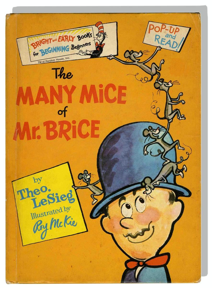 Very rare first edition, first printing of ''The Many Mice of Mr. Brice,'' written by Dr. Seuss under his pen-name, Theo LeSieg. Illustrated by Roy McKie in color, the book features pop-out colorful illustrations of Dr. Seuss' fanciful characters, revealed in a cornucopia of flaps, pop-ups, add-ons, and pull-tabs. Random House: New York: 1973. Issued without a dustjacket, book measures 6.75'' x 9.25'', and is in good condition with rear board starting to split. All pull-outs in working condition, and rare as such.