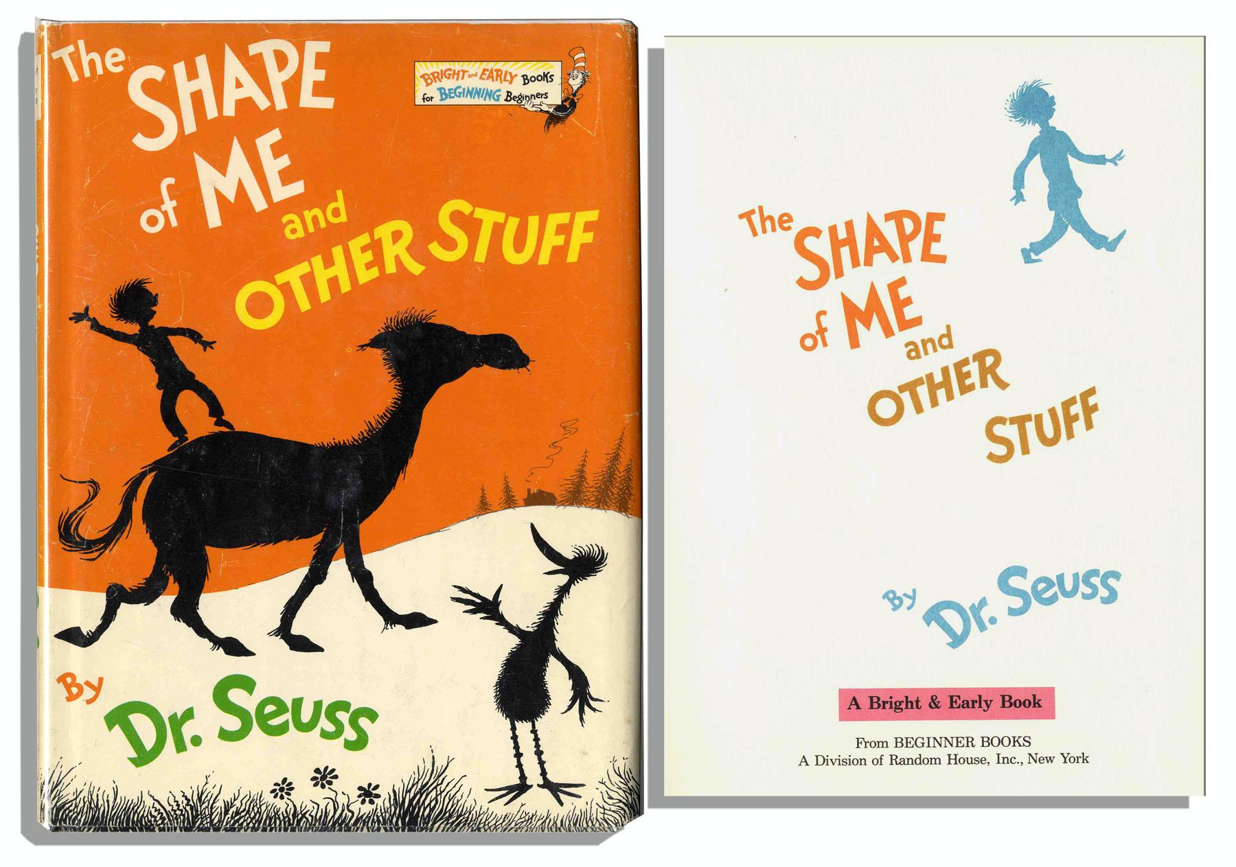 Dr. Seuss' ''The Shape of Me and Other Stuff'' first edition, first printing. In this exceptionally rare book, Seuss' illustrations are in silhouette (for the purpose of accentuating the outlines of figures), all done in his trademark wacky, amusing style. Random House: New York: 1973. Dustjacket is clean and intact with original $2.50 unclipped price. Hardcover book measures 6.75'' x 9.25'', in near fine condition.