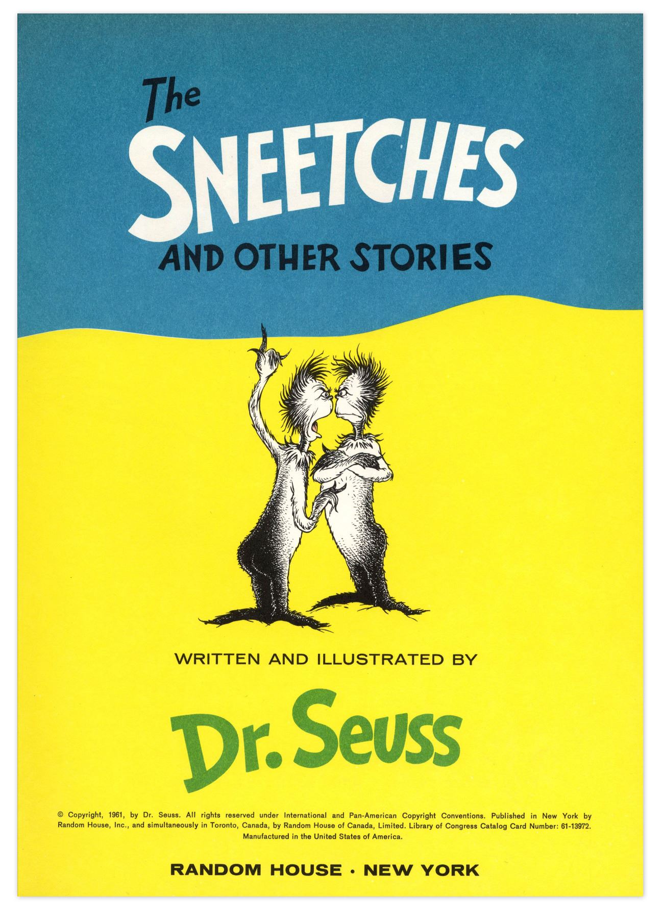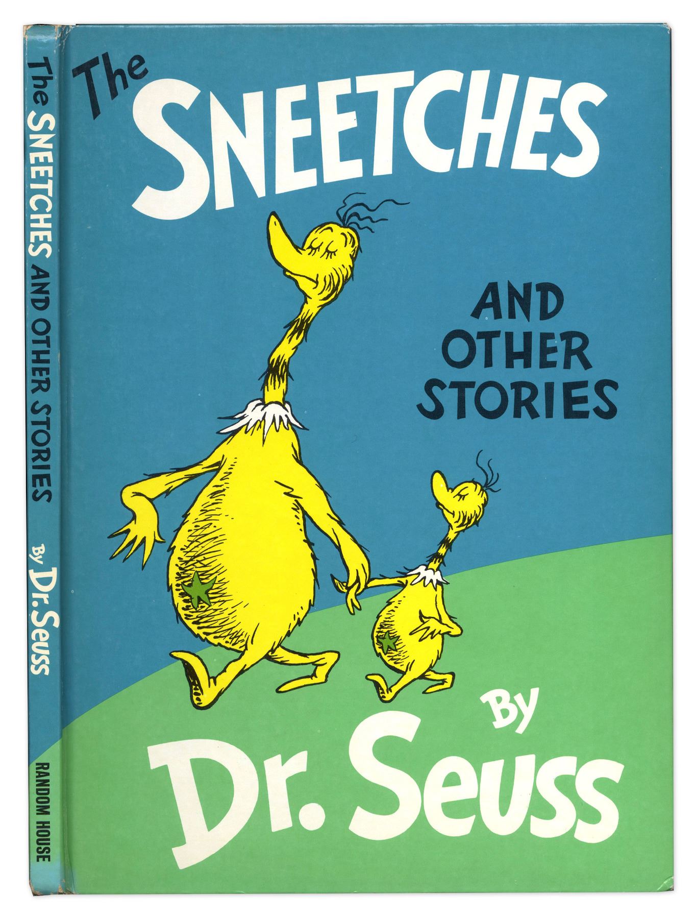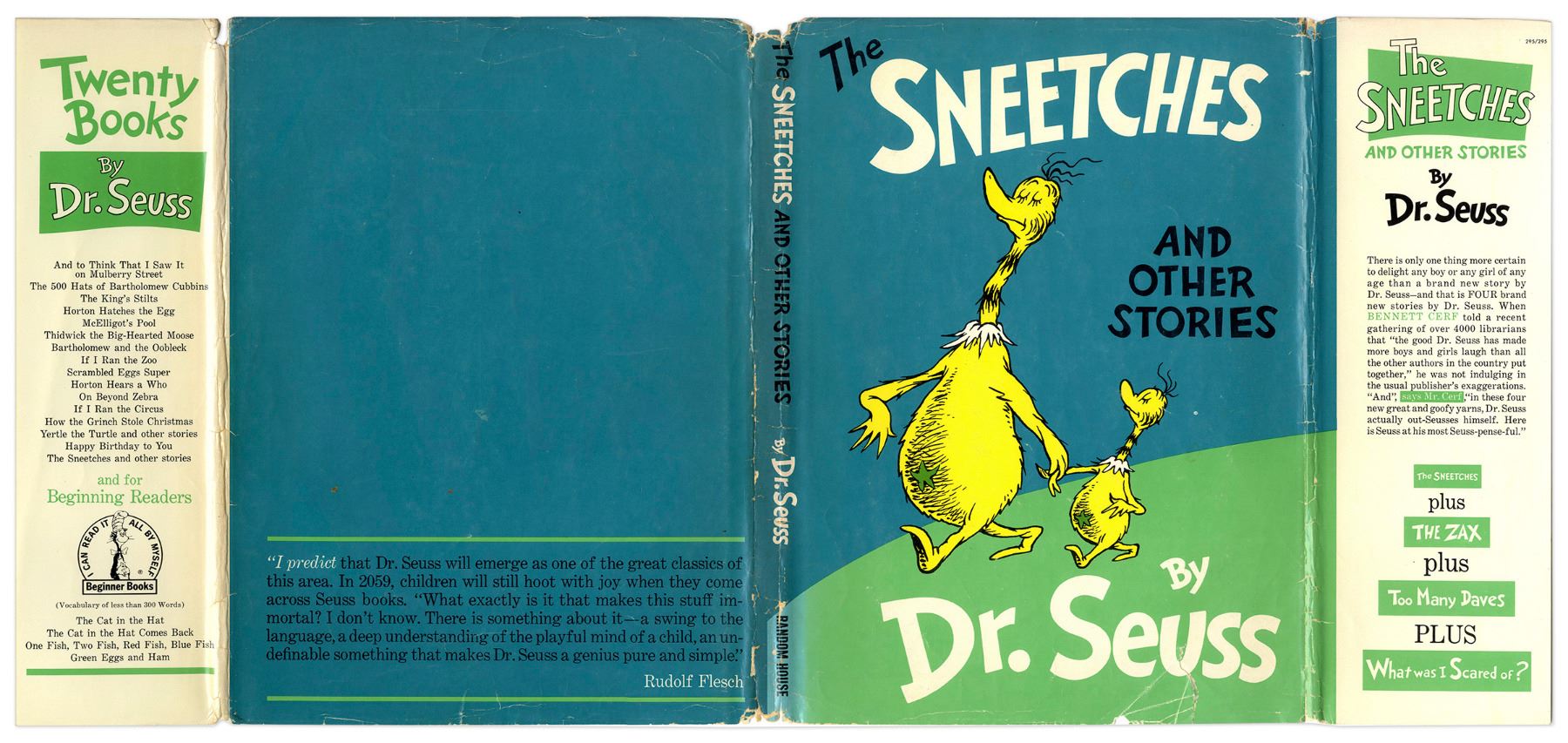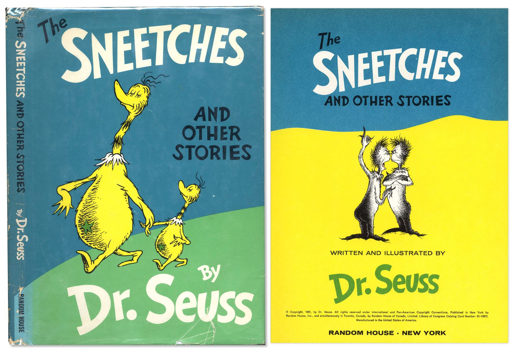 First edition, first printing of ''The Sneetches and Other Stories'', written and illustrated in full color by Dr. Seuss. A paramount collection of tongue-twisters, with the unforgettable tale of the unfortunate Sneetches, as told in the one-of-a-kind Seussian way. Random House: New York: 1961. In dust jacket, with original 295/295 unclipped price intact. Jacket has minor wear and creasing to edges, overall very good. Book, measuring 8.25'' x 11.25'', has minor wear to edges, else near fine.