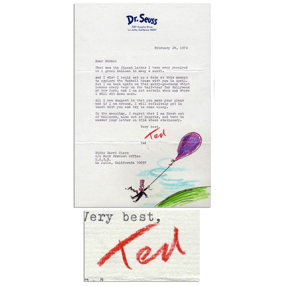 Dr. Seuss hand illustrated and signed letter, featuring ''The Cat in the Hat'' being pulled up and away by a large balloon. Letter dated 24 February 1972 on Dr. Seuss stationery to Diddo Clark reads in part, ''That was the finest letter I have every received on a green balloon in many a month...I am back again on that merry-go-round for Hollywood or New York...Ted''. Clark, an undergraduate at the University of California at San Diego, taught a class for freshman on the pursuit of excellence. Theodor Geisel (Seuss) was a guest speaker in the class. In 1972, Seuss was busy with his first animated special, ''The Lorax,'' which came out that year. Letter measuring 7.25'' x 10.25'' is mounted to a 10'' x 16'' mat. Fine condition.