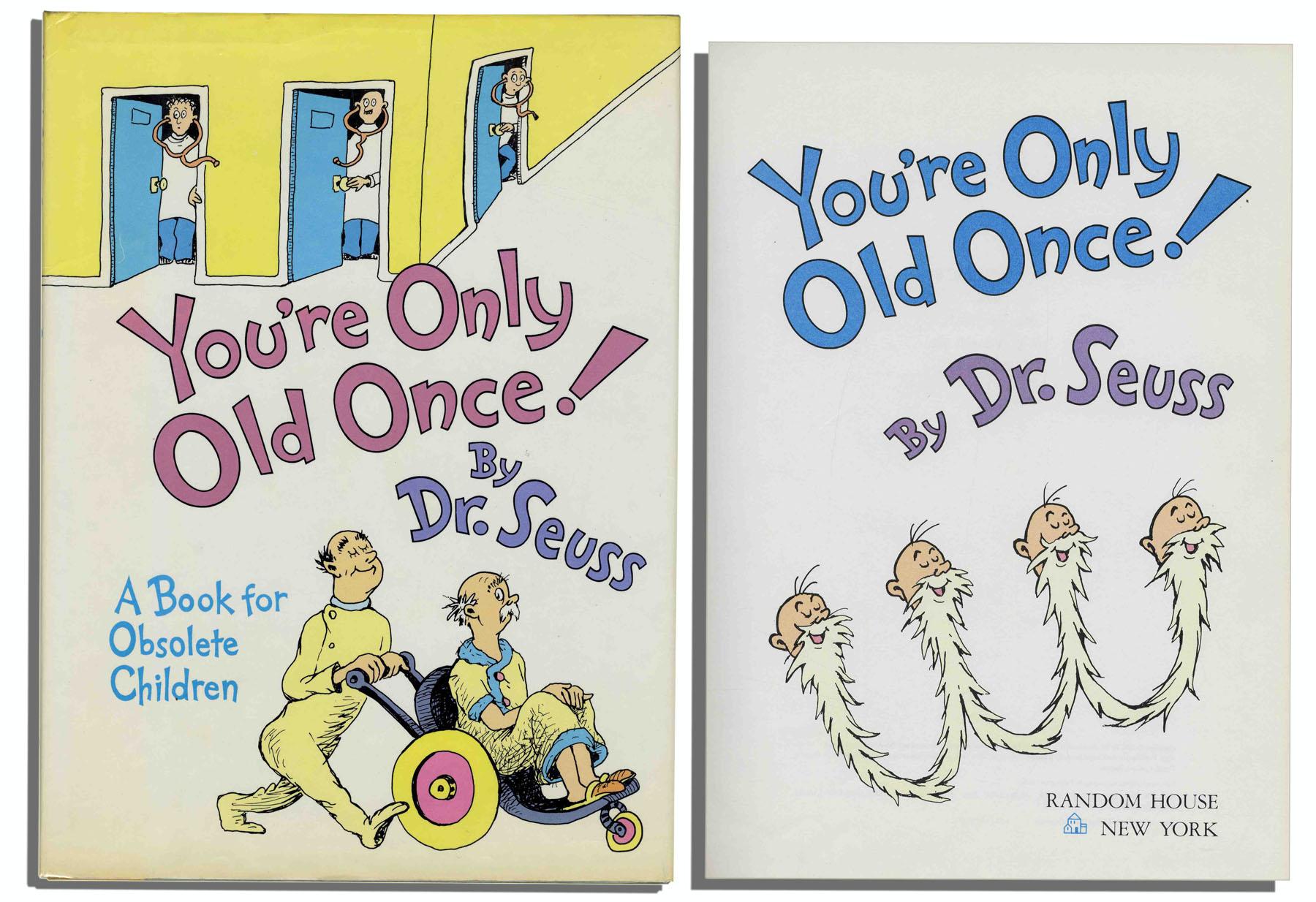 First edition, first printing of ''You're Only Old Once!'' written and illustrated by Dr. Seuss. Published on Seuss' 82nd birthday, on 2 March 1986, ''You're Only Old Once!'' explores the many joys of growing old in Seuss' imaginative portrayal, with full color illustrations throughout. Random House: New York: 1986. All first edition points present, with first edition complete number code printed on copyright page. Book measures 8.25'' x 11.5'' and is in near fine condition.