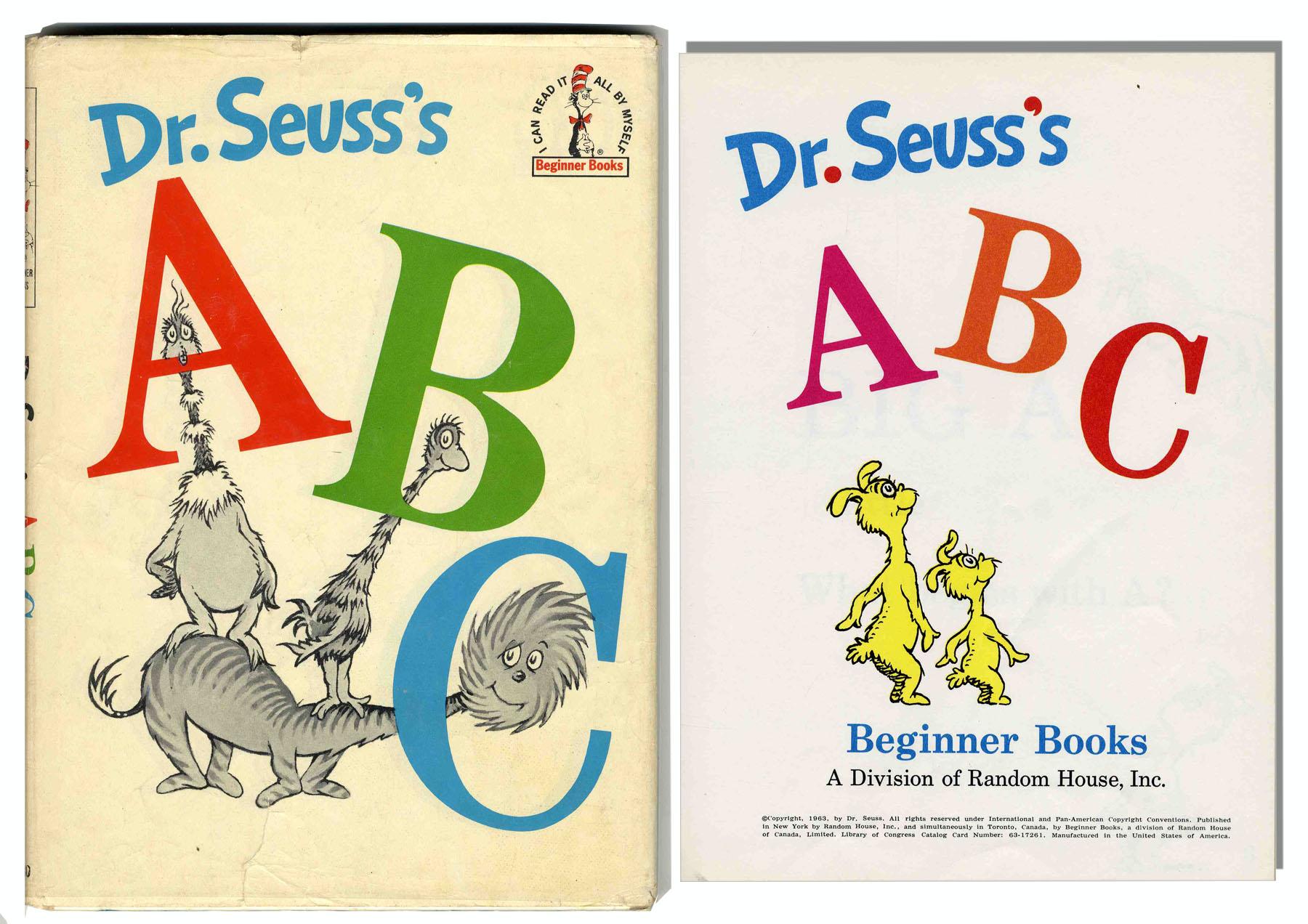 Rare first edition, first printing of ''Dr. Seuss's ABC'' written and illustrated by the famed author. Each letter is featured with Dr. Seuss' unmistakably nonsensical illustrations and text: ''Lion with a lollipop,'' ''Camel on the ceiling,'' ''Uncle Ubb's umbrella and his underwear, too.'' Random House: New York: 1963. Hardcover includes pictorial dustjacket with 195/195 price intact. Book, measuring 6.75'' x 9.25'', runs 63pp. and is in very good condition. Dustjacket in very good condition with wear to edges.