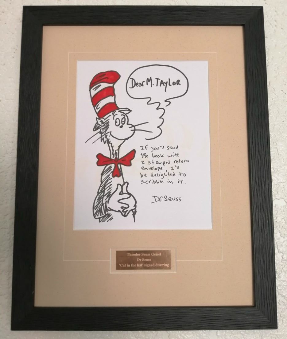 Inscribed and signed by Theodor Seuss Geisel, mounted with plaque and framed.