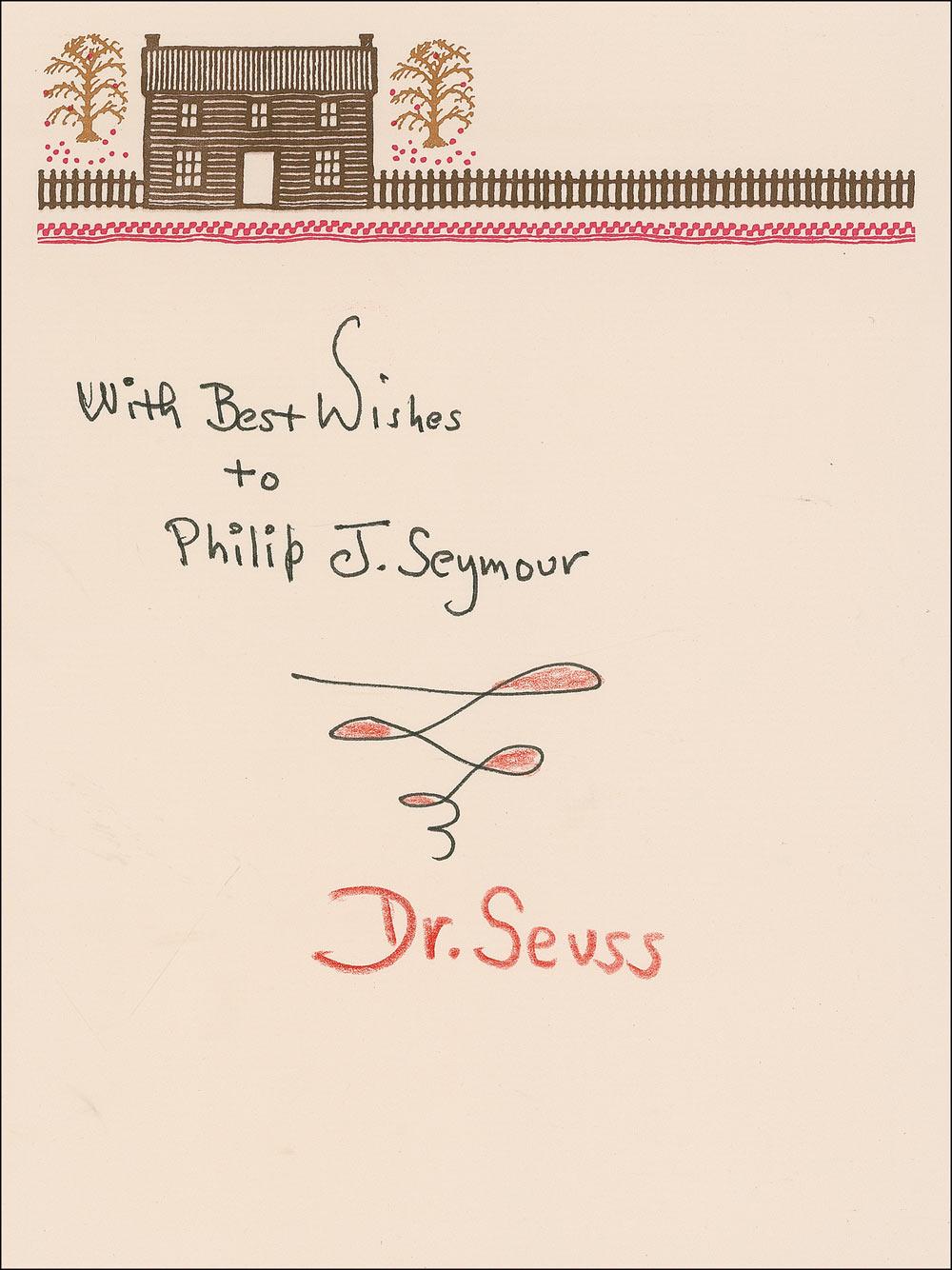 Felt tip inscription, “With Best Wishes to Philip J. Seymour” with a crayon signature, “Dr. Seuss,” on a light tan 6 x 8 sheet. The beloved author has added a decorative swirl between his inscription and signature in felt tip, coloring the loops with crayon. In fine condition.
