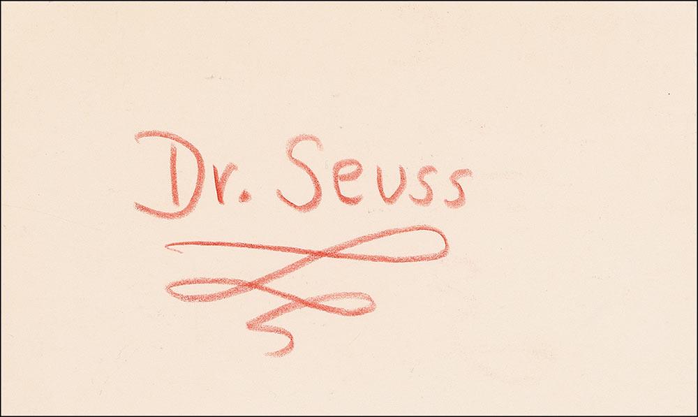 Red artist pencil signature, “Dr. Seuss,” on an off-white 5 x 3 card. In fine condition.