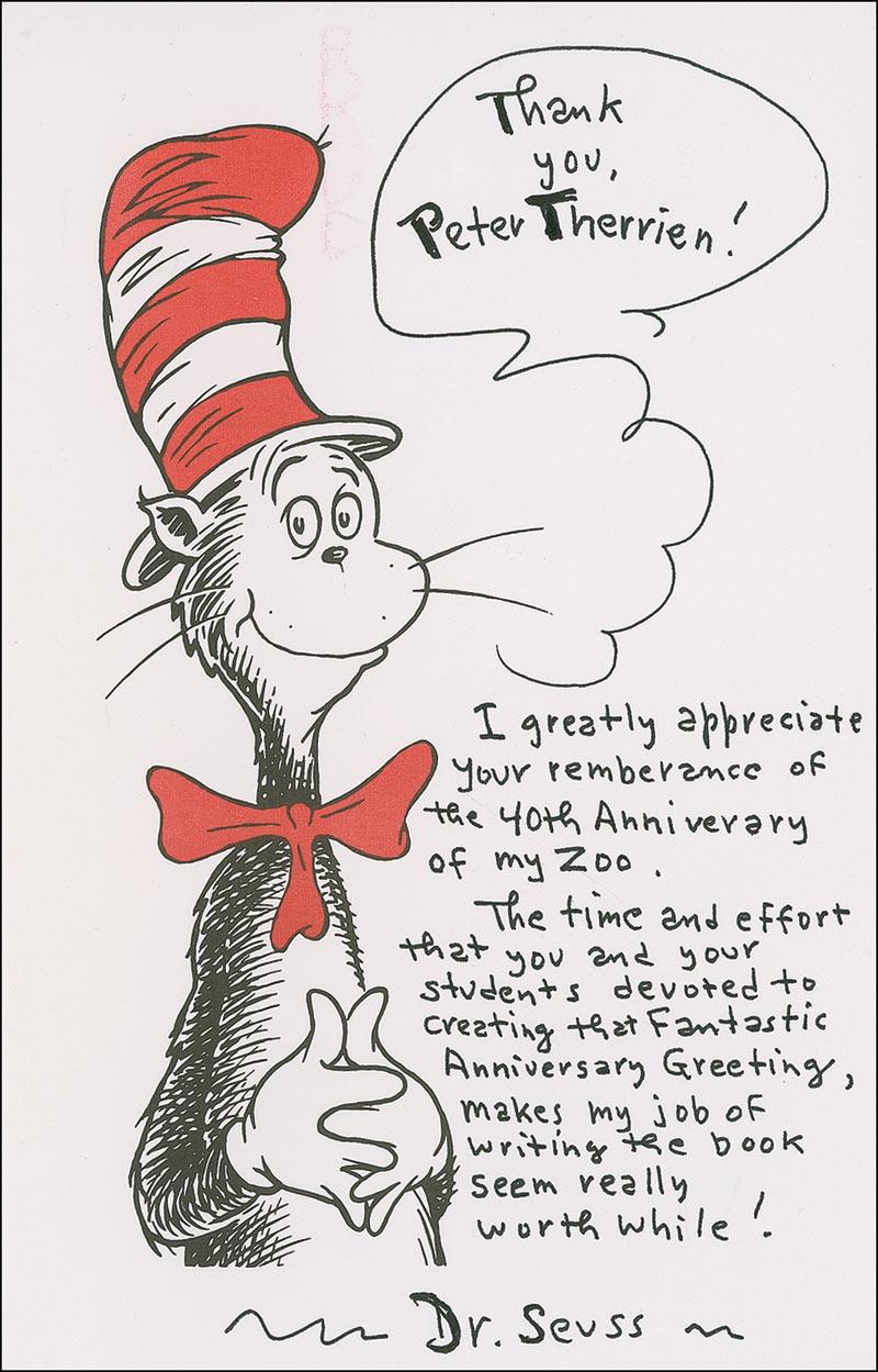 ANS, one page, 5.5 x 8, on a printed sketch of The Cat in the Hat no date. Note of thanks to a teacher. In full: “I greatly appreciate your remembrance of the 40th Anniversary of my Zoo. The time and effort that you and your students devoted to creating that fantastic anniversary greeting, make my job of writing the book seem really worthwhile!” Dr. Seuss has also drawn a word balloon coming from the cat, saying “Thank you, Peter Therrien!” In fine condition.