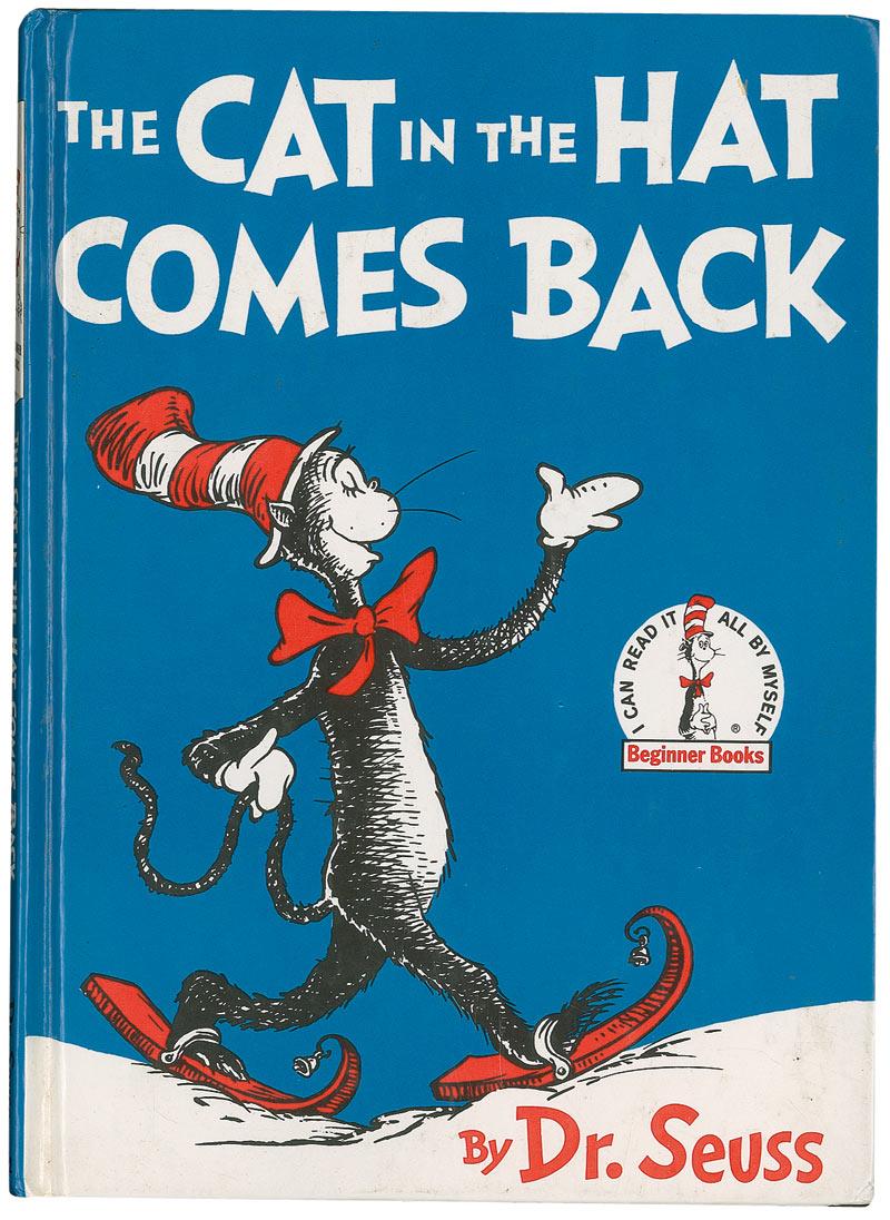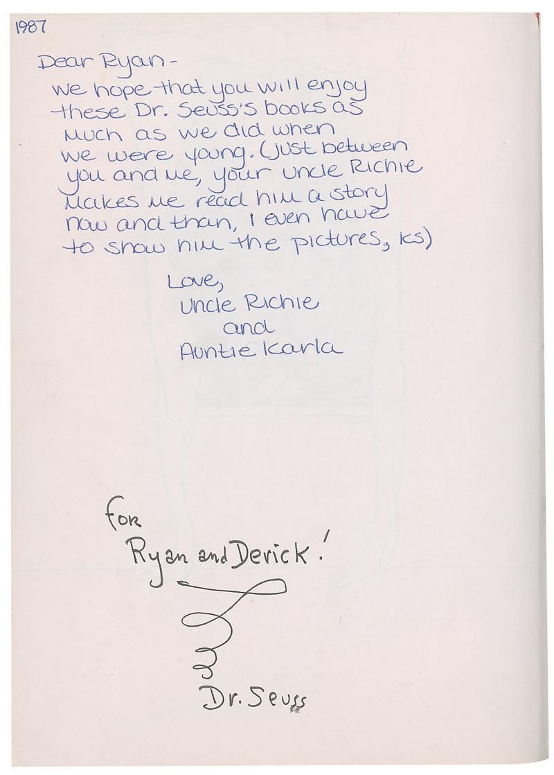 Signed book: The Cat in the Hat Comes Back. NY: Random House, 1958. Hardcover, 6.75 x 9.25. Signed and inscribed on the reverse of the first free end page, “To Ryan and Derick! Dr. Seuss.” Lengthy gift presentation to top of signed page, mild creasing to inside pages, with a few to signed page as well, and some light rubbing and wear to covers, otherwise fine condition.