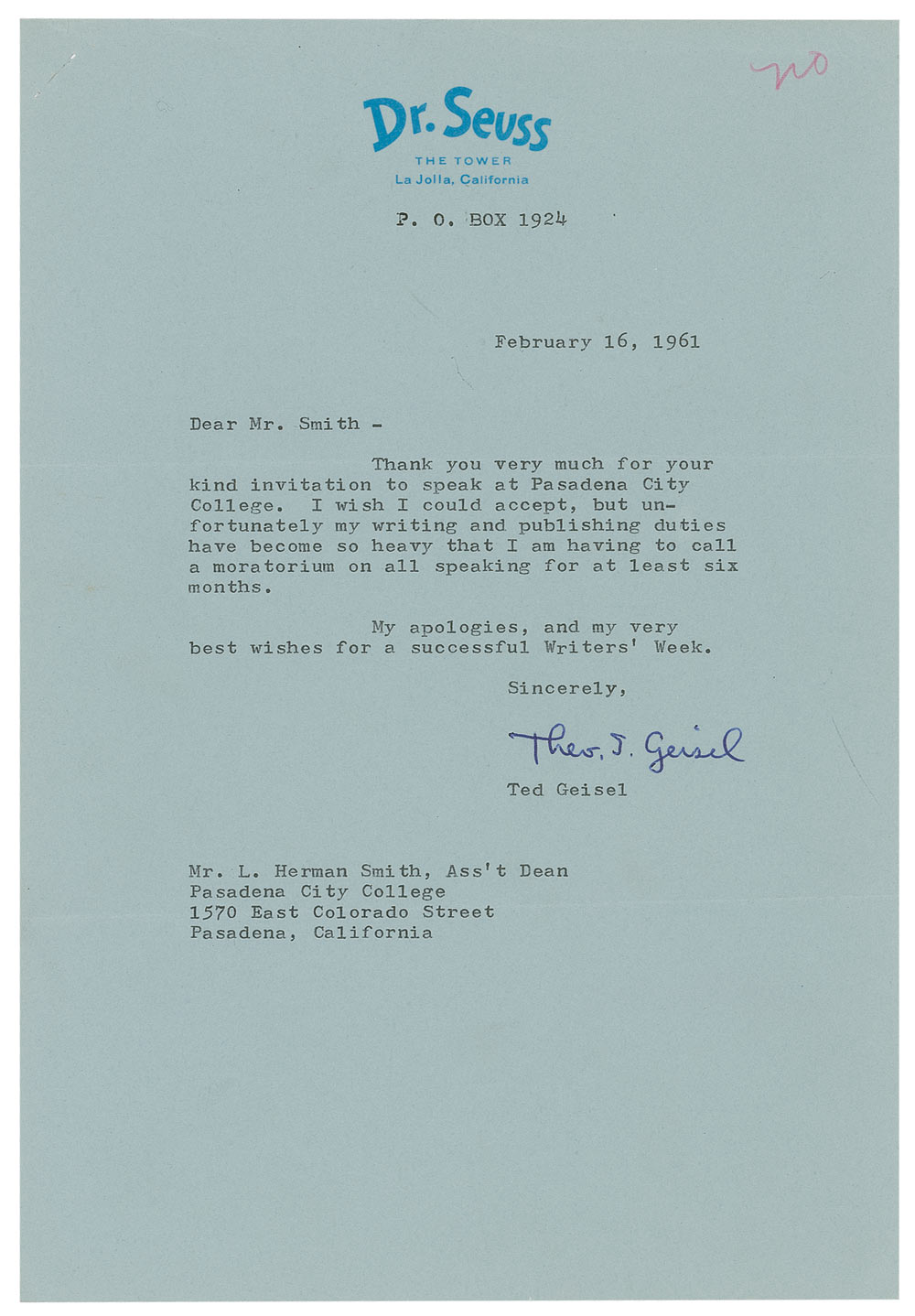 TLS signed “Theo. S. Geisel,” one page, 7.25 x 10.5, Dr. Seuss letterhead, February 16, 1961. Response to an invitation to speak at Pasadena City College. In part, “I wish I could accept, but unfortunately my writing and publishing duties have become so heavy that I am having to call a moratorium on all speaking for at least six months.” In fine condition, with a single staple hole to top left corner and a red pencil notation, “no,” to top right corner.
